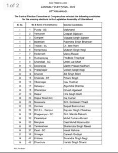 कांग्रेस की चिर प्रतिक्षित आगामी विधानसभा चुनाव 2022 उत्तराखंड हेतु प्रत्याशियों की पहली सूची जारी हो गई है इस सूची के पश्चात भी अनेक महत्वपूर्ण सीटों पर नामों की घोषणा होनी बाकी है–