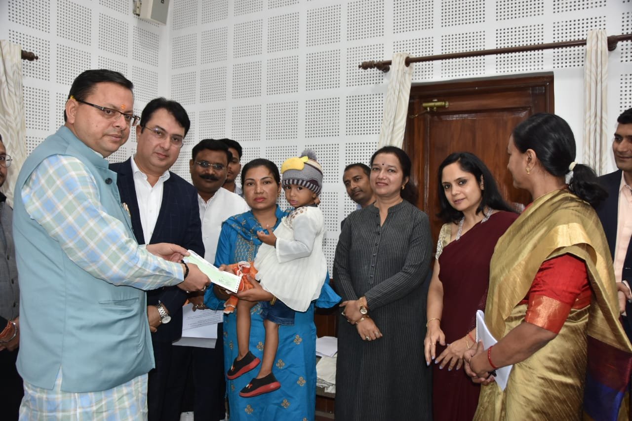 धामी ने कांस्टेबल स्वर्गीय प्रदीप कुमार की पत्नी को 50 लाख रुपए का चेक सौंपा
