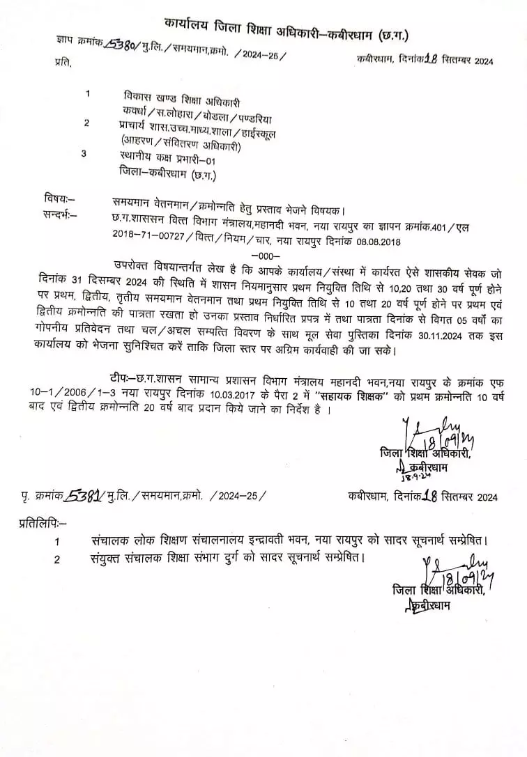 रायपुर। प्रदेश के उन सहायक शिक्षकों को क्रमोन्नत वेतन मिलेगा जिन्हें निर्धारित समय अवधि में पदोन्नति का लाभ नहीं मिल पाया है। इसके लिए जिला शिक्षा अधिकारी कबीरधाम ने विकासखंड शिक्षा अधिकारी और प्राचार्य को निर्देश जारी किया है। और आदेशित किया है कि उनके संस्था के अंतर्गत ऐसे कर्मचारी जो प्रथम और द्वितीय समयमान और प्रथम द्वितीय तथा तृतीय क्रमोन्नत वेतनमान की पात्रता रखते हैं उनका प्रस्ताव तैयार कर 30 नवंबर तक भेजें ।