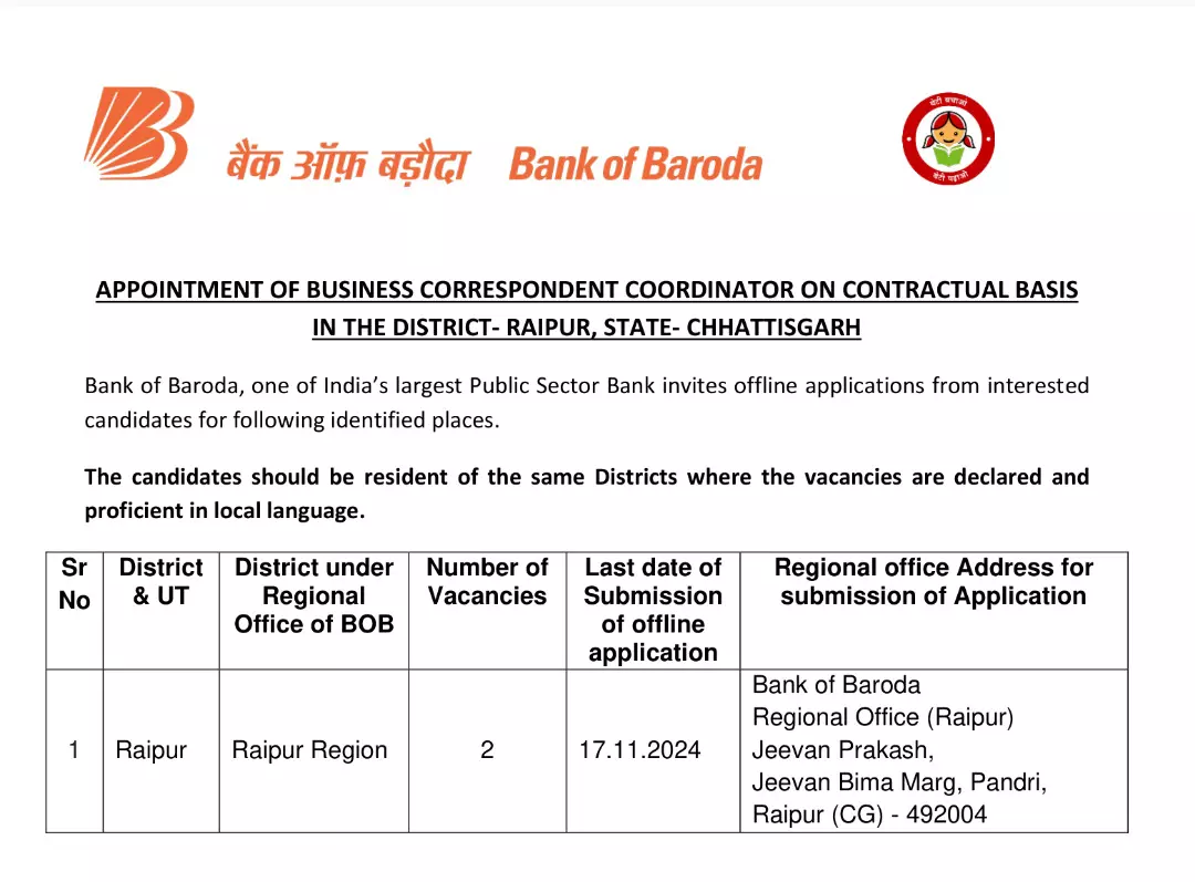 Bank Of Baroda Recruitment Raipur 2024: बैंक ऑफ बड़ौदा में नौकरी का मौका! बिना लिखित परीक्षा पाएँ 25,000 रुपये प्रतिमाह