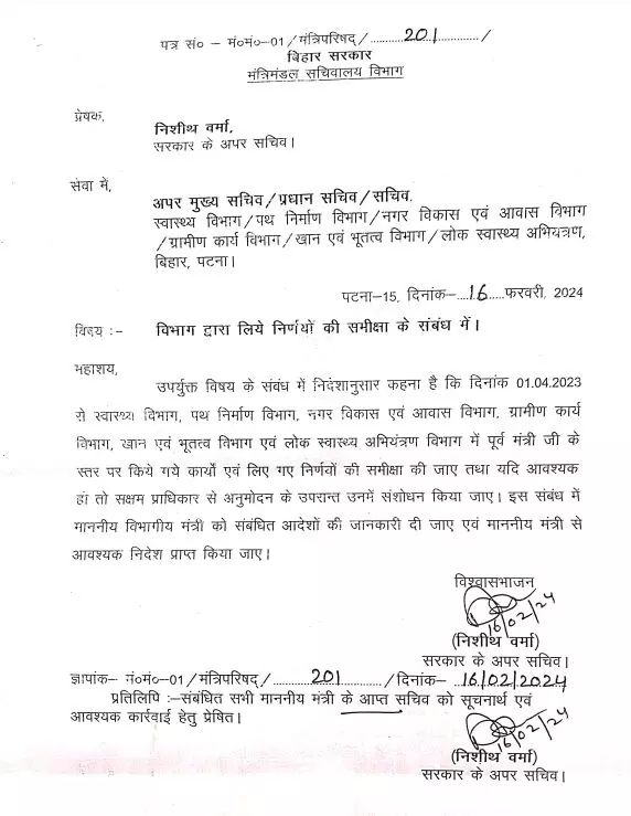 आदेश के अनुसार, यदि आवश्यक हो, तो उनमें संशोधन भी किया जाए. इस संबंध मे विभागीय मंत्री को संबंधित आदेशों की जानकारी दी जाए एवं मंत्री से आवश्यक निर्देश भी लिए जाएं. बता दें मुख्यमंत्री नीतीश कुमार ने विधानसभा में किए गए कार्यों की जांच करवाने की घोषणा भी की थी.