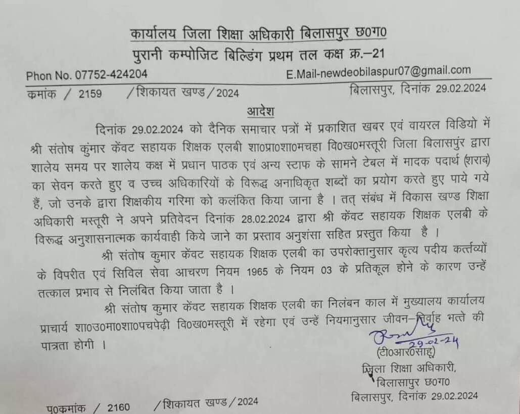 Bilaspur News बिलासपुर। प्रधान पाठिका के सामने बैठकर स्कूल में शराबखोरी करने वाले शिक्षक को डीईओ ने सस्पेंड कर दिया है। साथ ही डीईओ ने बीईओ को शिक्षक के खिलाफ एफआईआर दर्ज कराने के निर्देश दिए है। शिक्षक का नाम संतोष कुमार केवट, प्राइमरी स्कूल में पदस्थ है। ये पूरा मामला मस्तूरी ब्लाक के मचहा प्राइमरी स्कूल का है।