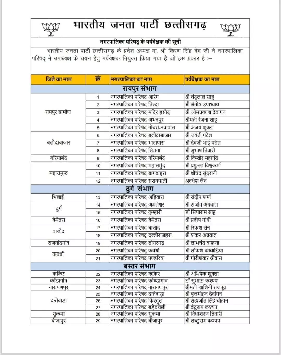 CG Election 2025: नगरीय निकायों में उपाध्यक्ष के चयन के लिए भाजपा ने जारी की पर्यवेक्षकों की सूची
