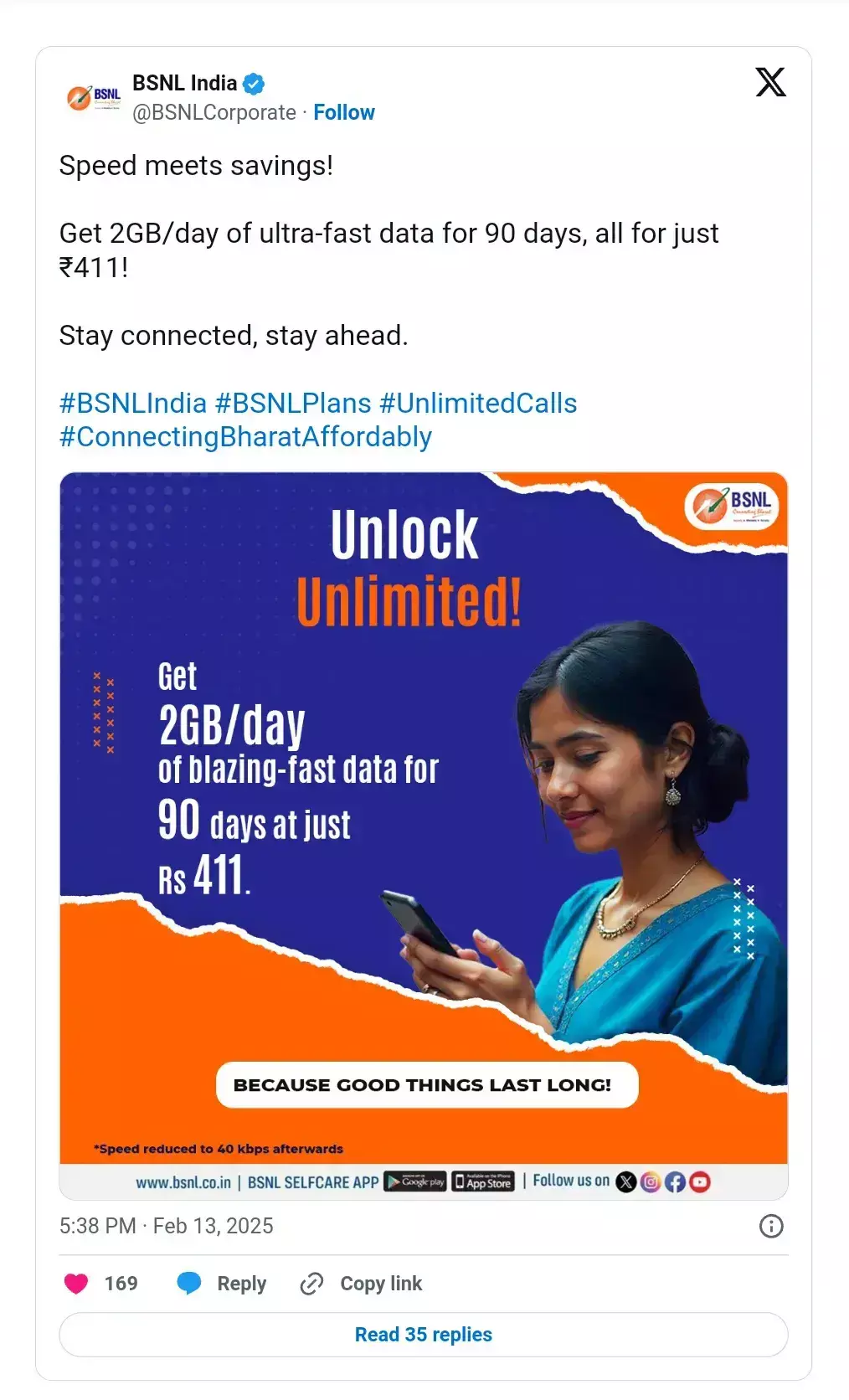 BSNL ने इस नए प्लान की जानकारी अपने सोशल मीडिया अकाउंट X (पहले ट्विटर) पर दी। कंपनी ने बताया कि अब ग्राहक सिर्फ 411 रुपये में 90 दिनों तक हर दिन 2GB डेटा का इस्तेमाल कर सकते हैं। इसका मतलब है कि आपको पूरी वैलिडिटी के दौरान कुल 180GB डेटा मिलेगा। यह उन लोगों के लिए बहुत अच्छी खबर है, जिन्हें हर महीने ज्यादा डेटा की जरूरत होती है, लेकिन वे महंगे रिचार्ज नहीं करवाना चाहते। BSNL ने यह भी बताया कि यह प्लान डेटा वाउचर के तौर पर उपलब्ध है, जिसका मतलब है कि इसमें आपको सिर्फ डेटा मिलेगा, कॉल करने की सुविधा नहीं मिलेगी।
