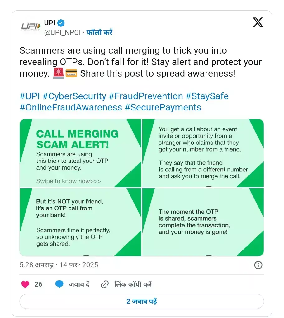 UPI ने अपने आधिकारिक X (ट्विटर) हैंडल पर कॉल मर्जिंग स्कैम को लेकर चेतावनी जारी की है। UPI_NPCI ने बताया है कि ठग कॉल मर्जिंग के जरिए लोगों को फंसा रहे हैं। UPI ने इस स्कैम की पूरी जानकारी दी है और इससे बचने के तरीके भी बताए हैं, ताकि आप सुरक्षित रह सकें।