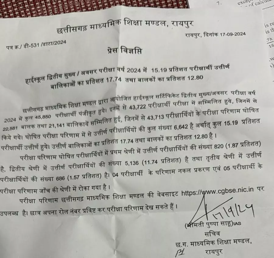 रायपुर। छत्तीसगढ़ माध्यमिक शिक्षा मंडल ने आज दसवीं द्वितीय मुख्य परीक्षा का रिजल्ट घोषित कर दिया। नतीजा काफी निराशाजनक रहा। 43713 विद्यार्थी इस परीक्षा में बैठे थे। मगर सिर्फ 15 परसेंट ही सफल हो पाए। उसमें भी प्रथम श्रेणी से सिर्फ 1.87 परसेंट विद्यार्थी ही पास हुए। देखिए माध्यमिक शिक्षा मंडल द्वारा जारी प्रेस नोट…