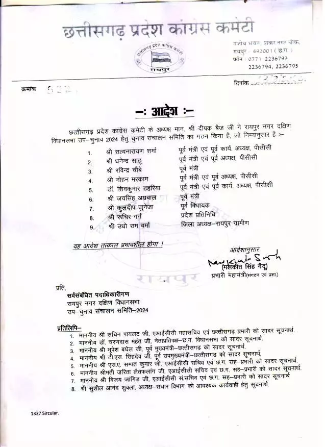 प्रदेश कांग्रेस की तरफ से जारी आदेश के अनुसार रायपुर दक्षिण विधानसभा क्षेत्र में होने वाले उप चुनाव के बनी संचालन समिति में पूर्व मंत्री सत्यनारायण शर्मा, धनेंद्र साहू, रविंद्र चौबे, मोहन मरकाम, शिव कुमार डहरिया और जय सिंह अग्रवाल के साथ रायपुर उत्तर सीट के पूर्व विधायक कुलदीप जुनेजा, रुचिर गर्ग और रायपुर ग्रामीण के जिलाध्यक्ष उधोराम वर्मा को समिति में रखा गया है।