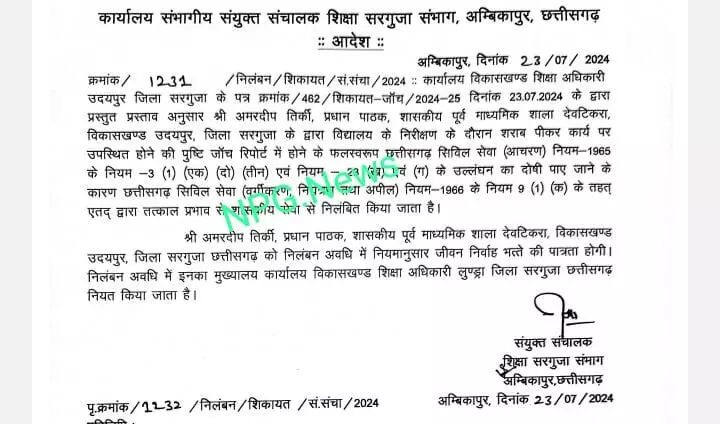 अंबिकापुर। नशे में स्कूल पहुंचने वाले शिक्षक को तत्काल प्रभाव से निलंबित कर दिया गया है। शिक्षक का नाम अमरदीप तिर्की है। नीचे देखें आदेश…