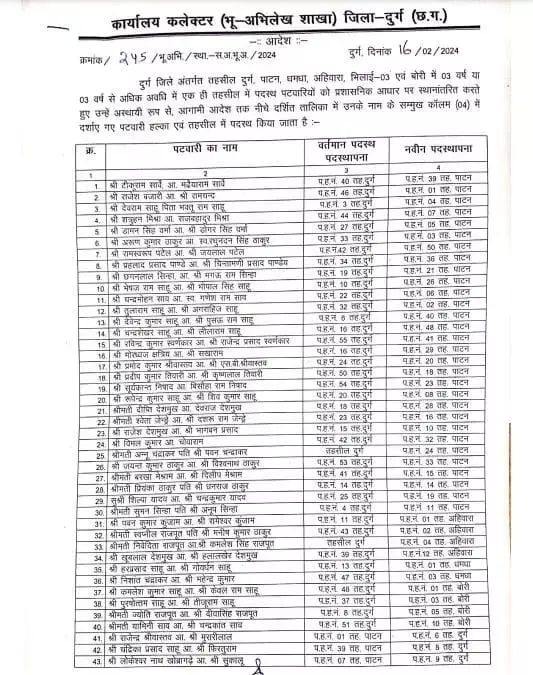CG Durg News: पटवारी ट्रांसफर: तीन सालों से एक ही जगह पर जमे 114 पटवारियों के तबादले, देखें लिस्ट