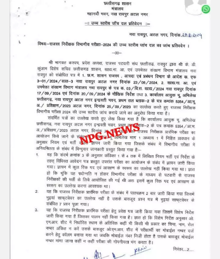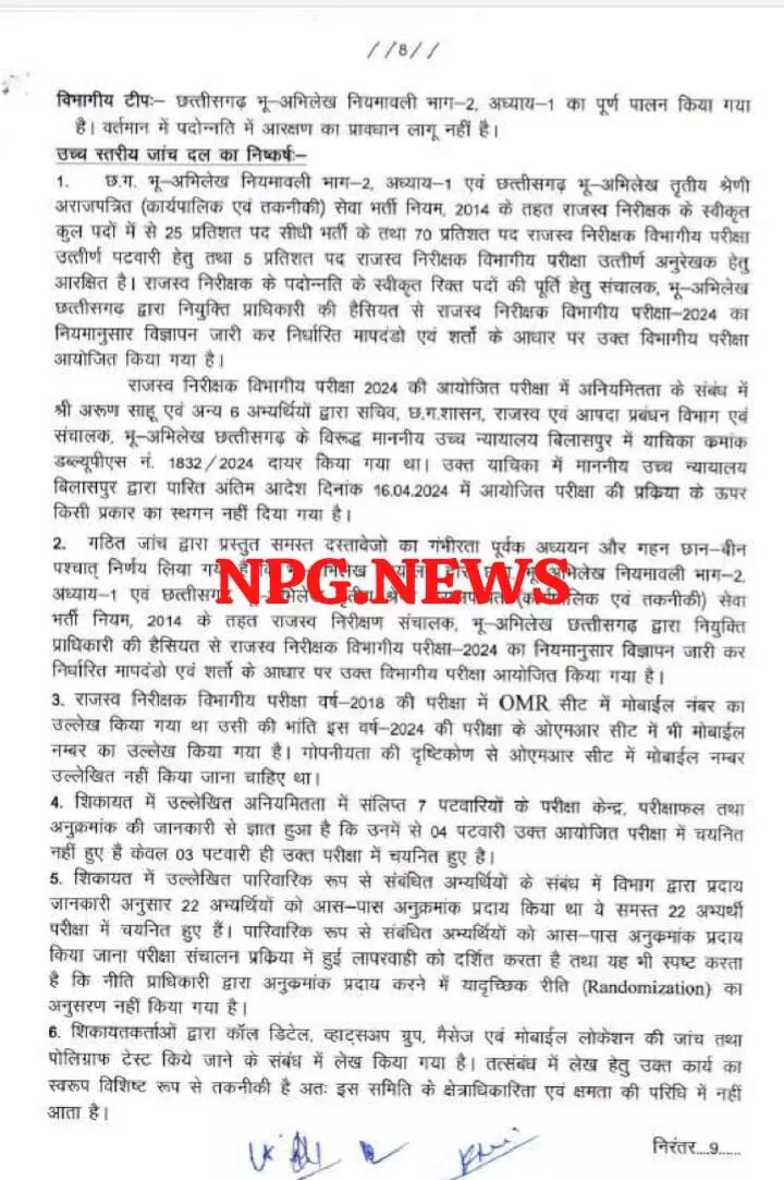 प्रकरण में छ.ग. शासन राजस्व एवं आपदा प्रबंधन विभाग मंत्रालय के आदेश क्रमांक एफ 03-01/2024/सात-3 दिनांक 23.08.2024 द्वारा राजस्व निरीक्षक विभागीय परीक्षा-2024 में हुई अनियमितताओं की उच्च स्तरीय जांच हेतु 05 सदस्यीय जांच दल का गठन किया गया है।