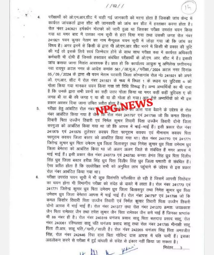 5. परीक्षा हेतु आंबटित रोल नंबर में आपसी रिश्तेदारों को आस पास बैठाने के उद्देश्य से रोल नंबर आबंटित किया गया है जैसे कि रोल नंबर 241797 एवं 241798 जो कि कमल किशोर तिवारी पिता उज्जैन तिवारी एवं निर्मल कुमार तिवारी पिता उज्जैन तिवारी दोनो जिला सरगुजा को आबंटित किया गया था जो कि आपस में भाई-भाई हैं। इसी प्रकार रोल नंबर 241975 एवं 241976 तुलेश्वर कश्यप पिता फागूराम कश्यप एवं मीनाराम कश्यप पिता फागूराम कश्यप जिला बस्तर को आबंटित किया गया था। रोल नंबर 241770 एव 241771 जितेन्द्र कुमार ध्रुव पिता उमेराम ध्रुव जिला बिलासपुर तथा निमेश कुमार ध्रुव पिता उमेराम ध्रुव जिला बेमेतरा को आबंटित्त किया था जो अलग अलग जिले से संबंधित हैं मगर आपस में भाई भाई हैं। इसी प्रकार रोल नंबर 240779 एवं 240780 कमशः हेमंत सिंह ध्रुव पिता दिलीप सिंह ध्रुव जिला बस्तर हरीश सिंह ध्रुव पिता दिलीप सिंह ध्रुव जिला धमतरी से संबंधित हैं। ऐसा प्रतीत होता है कि उल्लेखित सभी को अनुचित लाभ पहुंचाने के उद्देश्य से इस प्रकार रोल नंबर आबंटित किया गया था।