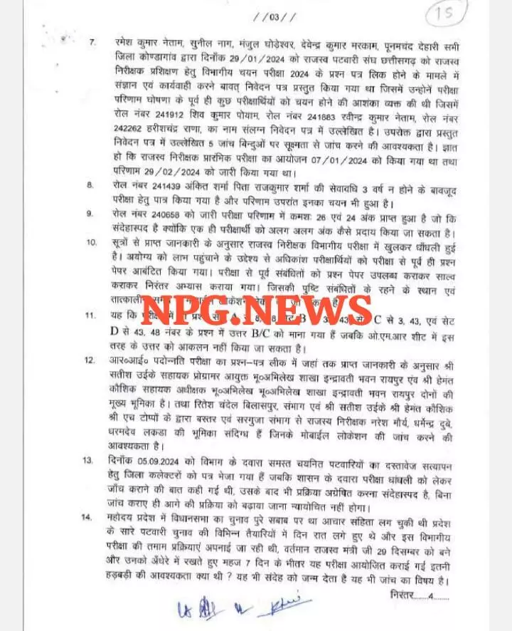 7. रमेश कुमार नेताम, सुनील नाग, मंजुल घोडेश्वर, देवेन्द्र कुमार मरकाम, पूनमचंद देहारी सभी जिला कोण्डागांव द्वारा दिनाँक 29/01/2024 को राजस्व पटवारी संघ छत्तीसगढ़ को राजस्व निरीक्षक प्रशिक्षण हेतु विभागीय चयन परीक्षा 2024 के प्रश्न पत्र लिक होने के मामले में संज्ञान एवं कार्यवाही करने बावत् निवेदन पत्र प्रस्तुत किया गया था जिसमें उन्होनें परीक्षा परिणाम घोषणा के पूर्व ही कुछ परीक्षार्थियों को चयन होने की आशंका व्यक्त की थी जिसमें रोल नंबर 241912 शिव कुमार पोयाम, रोल नंबर 241883 रवीन्द्र कुमार नेताम, रोल नंबर 242262 हरीशचंद्र राणा, का नाम संलग्न निवेदन पत्र में उल्लेखित है। उपरोक्त द्वारा प्रस्तुत निवेदन पत्र में उल्लेखित 5 जांच बिन्दुओं पर सूक्ष्मता से जांच करने की आवश्यकता है। ज्ञात हो कि राजस्व निरीक्षक प्रारंभिक परीक्षा का आयोजन 07/01/2024 को किया गया था तथा परिणाम 29/02/2024 को जारी किया गया था।