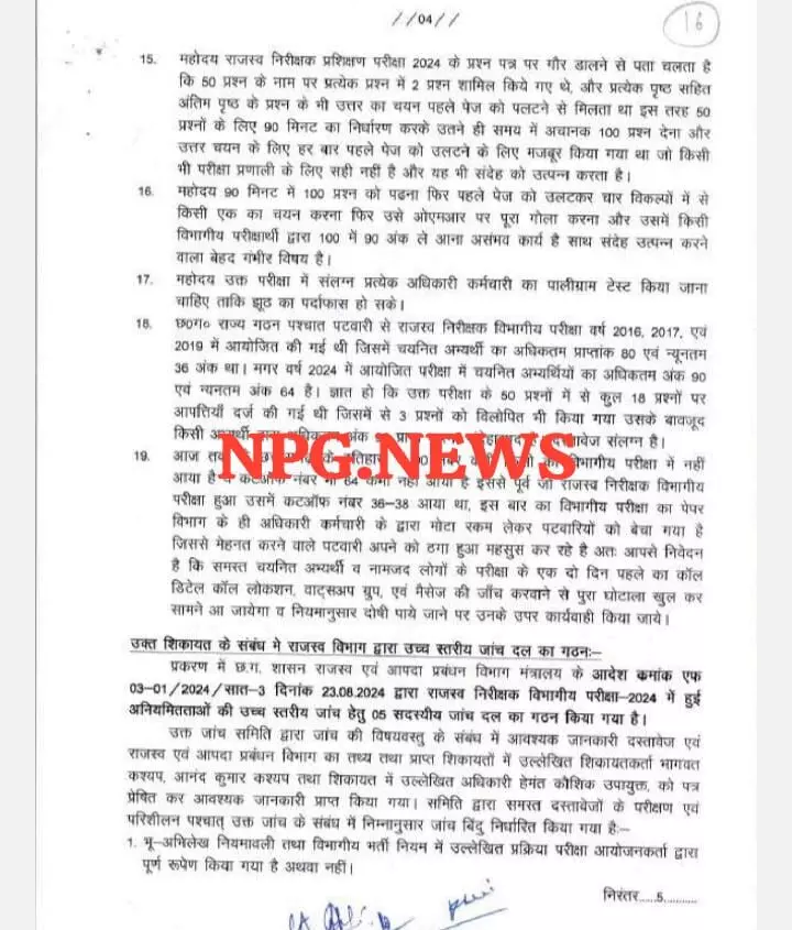 18. छत्तीसगढ़ राज्य गठन पश्चात पटवारी से राजस्व निरीक्षक विभागीय परीक्षा वर्ष 2016, 2017, एवं 2019 में आयोजित की गई थी जिसमें चयनित अभ्यर्थी का अधिकतम प्राप्तांक 80 एवं न्यूनतम 36 अंक था। मगर वर्ष 2024 में आयोजित परीक्षा में चयनित अभ्यर्थियों का अधिकतम अंक 90 एवं न्यनतम अंक 64 है। ज्ञात हो कि उक्त परीक्षा के 50 प्रश्नों में से कुल 18 प्रश्नों पर आपत्तियाँ दर्ज की गई थी जिसमें से 3 प्रश्नों को विलोपित भी किया गया उसके बावजूद किसी अभ्यर्थी द्वारा अधिकतम अंक 90 प्राप्त करना संदेहास्पद है। दस्तावेज संलग्न है।