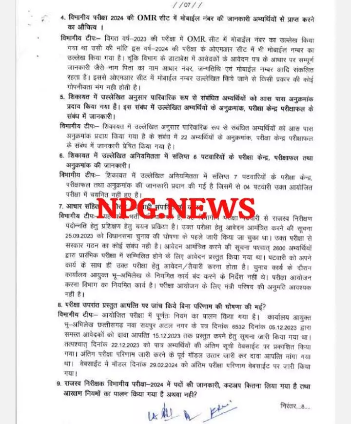 विभागीय टीपः- आयोजित परीक्षा में पूर्णतः नियम का पालन किया गया है। कार्यालय आयुक्त भू-अभिलेख छत्तीसगढ़ नवा रायपुर अटल नगर के पत्र दिनांक 6532 दिनांक 05.12.2023 द्वारा समस्त आवेदकों को दावा आपत्ति 15.12.2023 तक प्रस्तुत करने हेतु सूचना जारी किया गया था। तत्पश्चात् दिनांक 22.12.2023 को पात्र अभ्यर्थियों की अंतिम सूची वेबसाईट पर प्रकाशित किया गया। अंतिम परीक्षा परिणाम जारी करने के पूर्व मॉडल उत्तर जारी कर दावा आपत्ति मांगा गया था। वेबसाईट में मॉडल दिनांक 29.02.2024 को अंतिम परीक्षा परिणाम वेबसाईट पर जारी किया गया।
