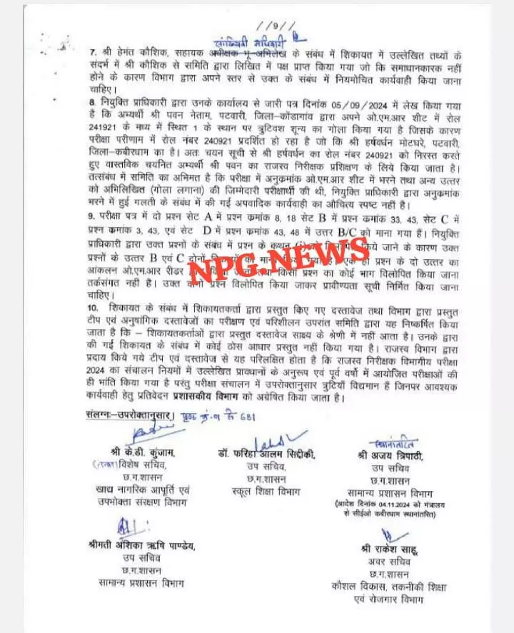 6. परीक्षा उपरांत चयन सूची में भी कुछ विसंगति परीलक्षित हो रही है जिसमें आपसी रिश्तेदार का चयन होना भी विभागीय परीक्षा को संदेह के दायरे में लाता है। रोल नंबर 241770 एवं 241771 जितेन्द्र कुमार ध्रुव पिता उमेराम ध्रुव जिला बिलासपुर तथा निमेश कुमार ध्रुव पिता उमेराम ध्रुव जिला बेमेतरा आपस में भाई भाई हैं। रोल नंबर 241797 एवं 241798 जो कि कमल किशोर तिवारी पिता उज्जैन तिवारी एवं निर्मल कुमार तिवारी पिता उज्जैन तिवारी दोनो आपस में भाई भाई हैं। रोल नंबर 241377 तथा रोल नंबर 241370 क्रमशः जयप्रकाश जैन पिता रामेश्वर जैन तथा तपेश कुमार जैन पिता रामेश्वर जैन सगे भाई हैं जिनका प्राप्तांक भी 88 नंबर ही है। रोल नंबर 240319 धनंजय प्रसाद साहू पिता बलदाउ प्रसाद साहू, रोल नंबर 240061 रश्मिलता साहू पति धनंजय प्रसाद साहू तथा रोल नंबर 241785 मीनाक्षी साहू पिता टी.आर. साहू पति/पत्नी/साली है। रोल नंबर 242265 धनंजय सिंह पिता अमरजीत सिंह, रोल नंबर 242446 रिया दास पिता गोविन्द दास आपस में पति पत्नी हैं। इसका अवलोकन करने से परीक्षा में हुई धांधली के संदेह से इंकार नहीं किया जा सकता है।
