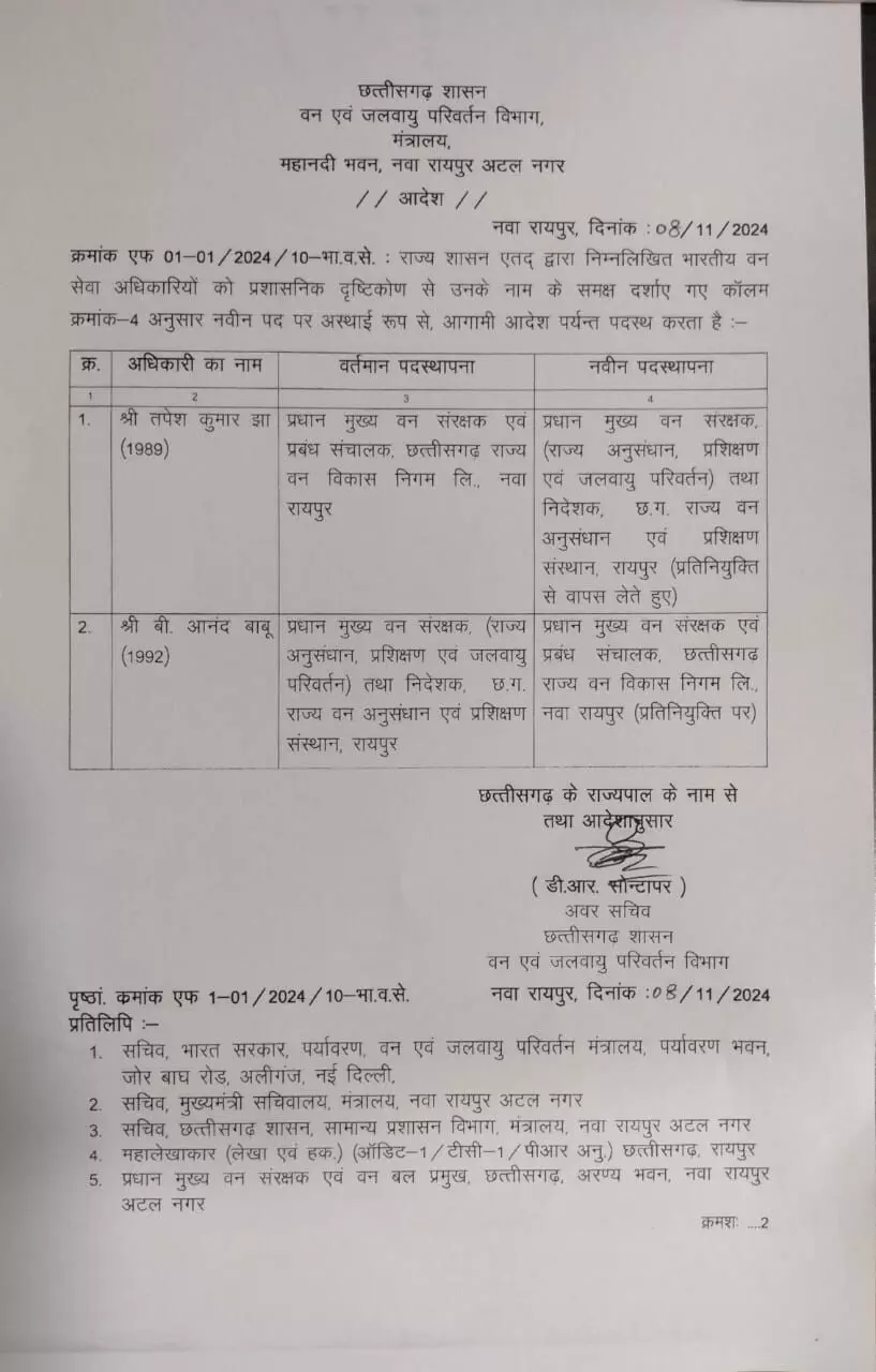 इसके अलावा 1992 बैच के बी आनंद बाबू को प्रधान मुख्य वन संरक्षक (राज्य अनुसंधान प्रशिक्षण एवं जलवायु परिवर्तन) तथा निदेशक छत्तीसगढ़ राज्य वन अनुसंधान एवं प्रशिक्षण संस्थान रायपुर के पद से प्रधान मुख्य वन संरक्षक एवं प्रबंध संचालक राज्य वन विकास निगम लिमिटेड नया रायपुर प्रतिनियुक्ति पर भेजा गया है।