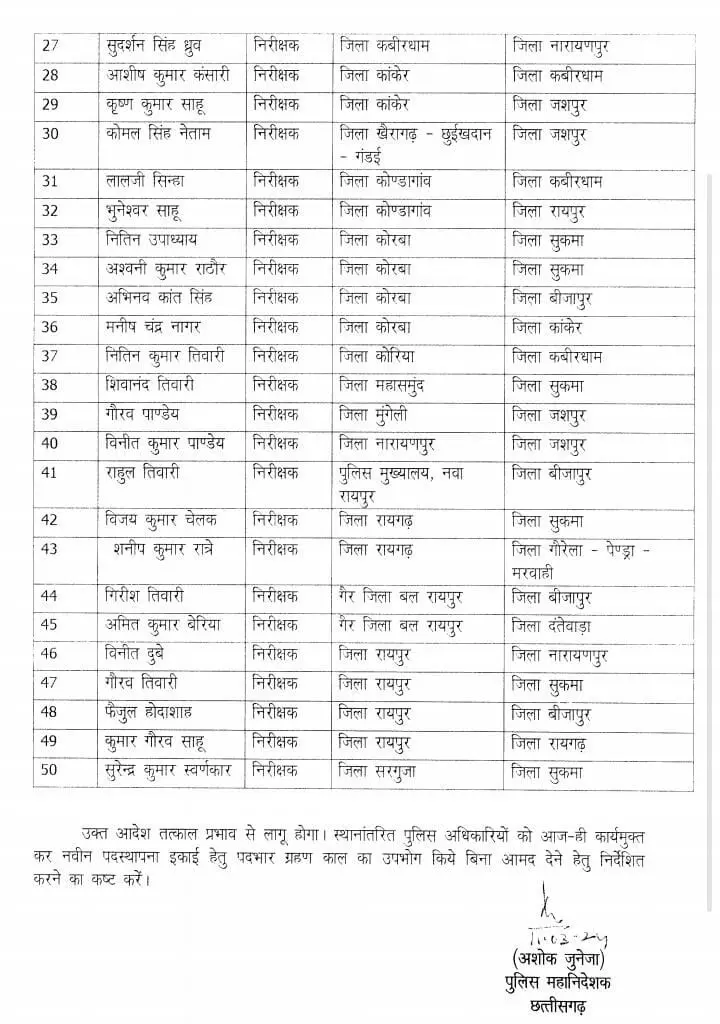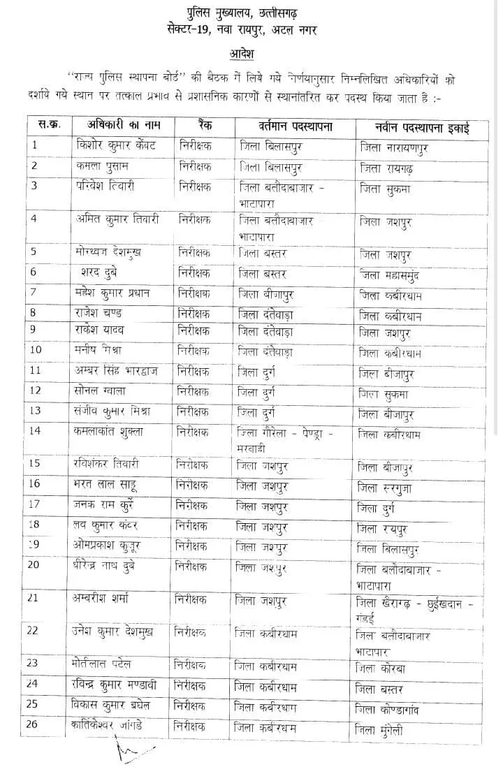 CG इंस्पेक्टर ट्रांसफर: पुलिस विभाग में बड़ी सर्जरी, 50 निरीक्षकों का हुआ तबादला… रायपुर, दुर्ग, बिलासपुर के इंस्पेक्टर हटाये गए…