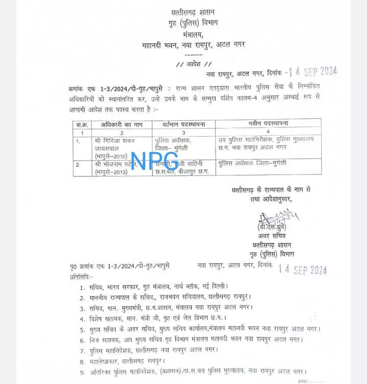 CG IPS पोस्टिंग: मुंगेली क़े एसपी गिरिजाशंकर जायसवाल हटाए गए, भोजराज पटेल होंगे नए कप्तान
