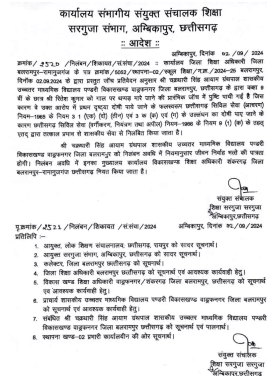 वहीं पूरे मामले का प्रतिवेदन कार्यालय जिला शिक्षा अधिकारी जिला बलरामपुर–रामानुजगंज ने संयुक्त संचालक शिक्षा संभाग सरगुजा को भेजा था। जिसके बाद शिक्षक चक्रधारी सिंह आयाम ग्रंथपाल शासकीय उच्चतर माध्यमिक विद्यालय पंडरी विकासखंड वाड्रफनगर जिला बलरामपुर को प्रथम दृष्टया दोषी पाते हुए निलंबित कर दिया गया है। निलंबन अवधि में उनका मुख्यालय कार्यालय विकासखंड शिक्षा अधिकारी शंकरगढ़ जिला बलरामपुर–रामानुजगंज नियत किया गया है। नीचे देखें आदेश…