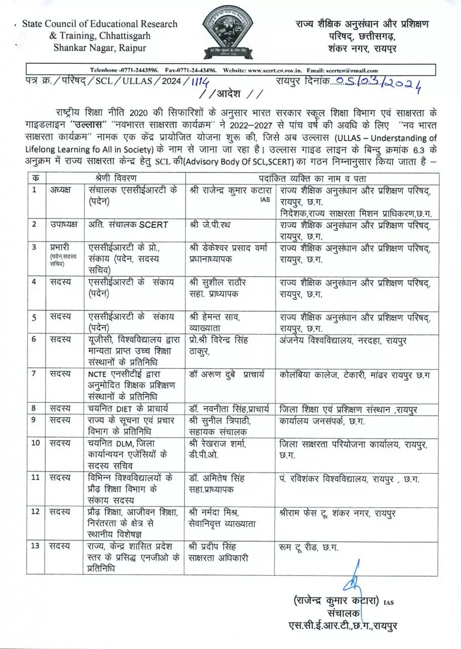 रायपुर। राष्ट्रीय शिक्षा नीति-2020 की सिफारिशों के अनुसार भारत सरकार स्कूल शिक्षा विभाग एवं साक्षरता के गाइडलाइन ‘उल्लास‘ ने 2022-2027 से पांच वर्ष की अवधि के लिए ‘नव भारत साक्षरता कार्यक्रम‘ नामक केन्द्र प्रायोजित योजना शुरू की, जिसे अब उल्लास के नाम से जाना जा रहा है। उल्लास गाइड लाइन के अनुसार राज्य साक्षरता केन्द्र हेतु एससीएल की एडवाईजरी बोर्ड का गठन किया गया है।