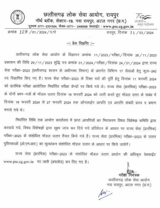 CG PSC: पीएससी भर्ती 2023 का संशोधित माडल उत्तर जारी: पीएससी की वेबसाइट पर हो गया अपलोड, इसी के आधार पर होगा मूल्यांकन