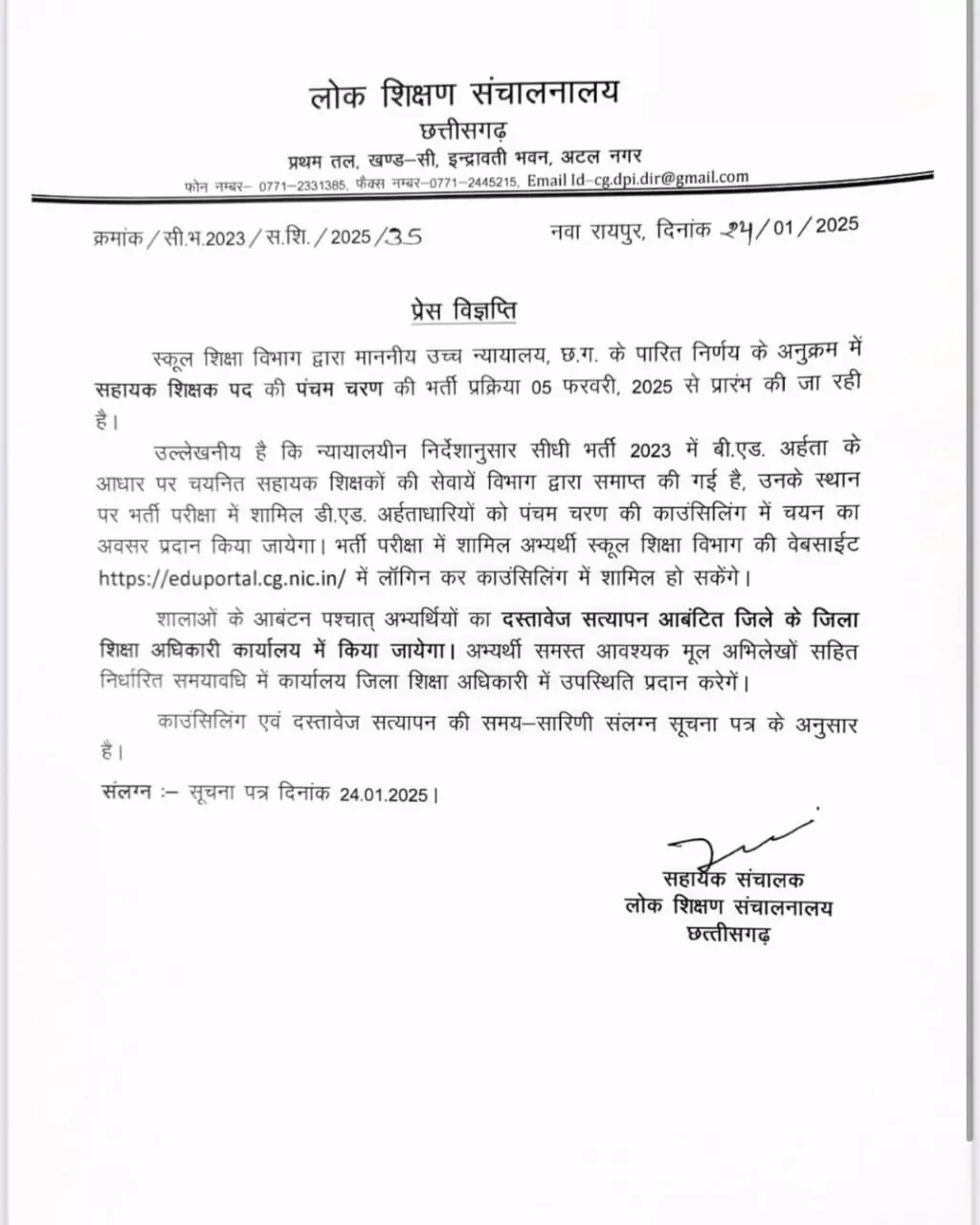 CG Teacher News: रायपुर। स्कूल शिक्षा विभाग द्वारा उच्च न्यायालय के पारित निर्णय के अनुक्रम में बीएड प्रशिक्षित 2855 सहायक शिक्षकों को नौकरी से हटा दिया है। उनकी जगह डीएलएड प्रशिक्षित अभ्यर्थियों को नियुक्ति देने की प्रक्रिया शुरू कर दी गई है। बीएड की जगह भर्ती परीक्षा में शामिल डीएलएड अहर्ता धारियों के लिए पंचम चरण की काउंसलिंग में चयन का अवसर प्रदान किया जाएगा। भर्ती परीक्षा में शामिल अभ्यर्थी स्कूल शिक्षा विभाग की वेबसाईट https://eduportal.cg.nic.in पर लॉगिन कर काउंसलिंग में शामिल हो सकते हैं।