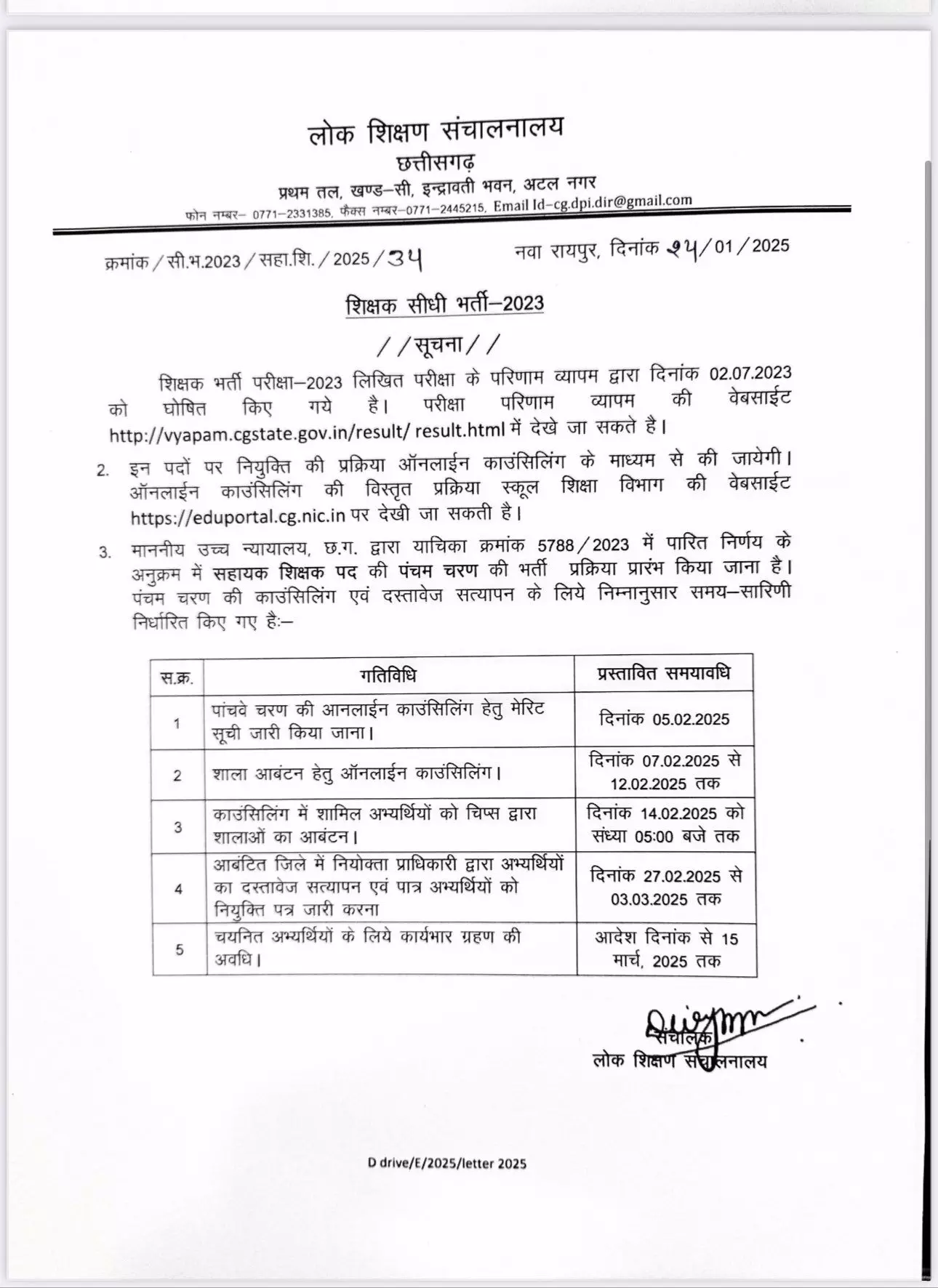 शिक्षक भर्ती परीक्षा 2023 लिखित परीक्षा के परिणाम 2 जुलाई 2023 को घोषित किए गए थे। इन पदों पर उच्च न्यायालय के द्वारा दिए गए निर्णय के अनुक्रम में सहायक शिक्षक पद की पंचम चरण की भर्ती प्रक्रिया प्रारंभ किया जाना है। पांचवे चरण की ऑनलाइन काउंसलिंग हेतु मेरिट सूची 5 फरवरी को जारी की जाएगी।शाला आबंटन हेतु ऑनलाइन काउंसलिंग 7 फरवरी 2025 से 12 फरवरी तक होगी। काउंसलिंग में शामिल अभ्यर्थियों को चिप्स द्वारा शालाओं का आबंटन 14 फरवरी को किया जाएगा। चयनित अभ्यर्थियों के लिए कार्यभार ग्रहण की अवधि आदेश दिनांक से 15 मार्च 2025 तक होगी।