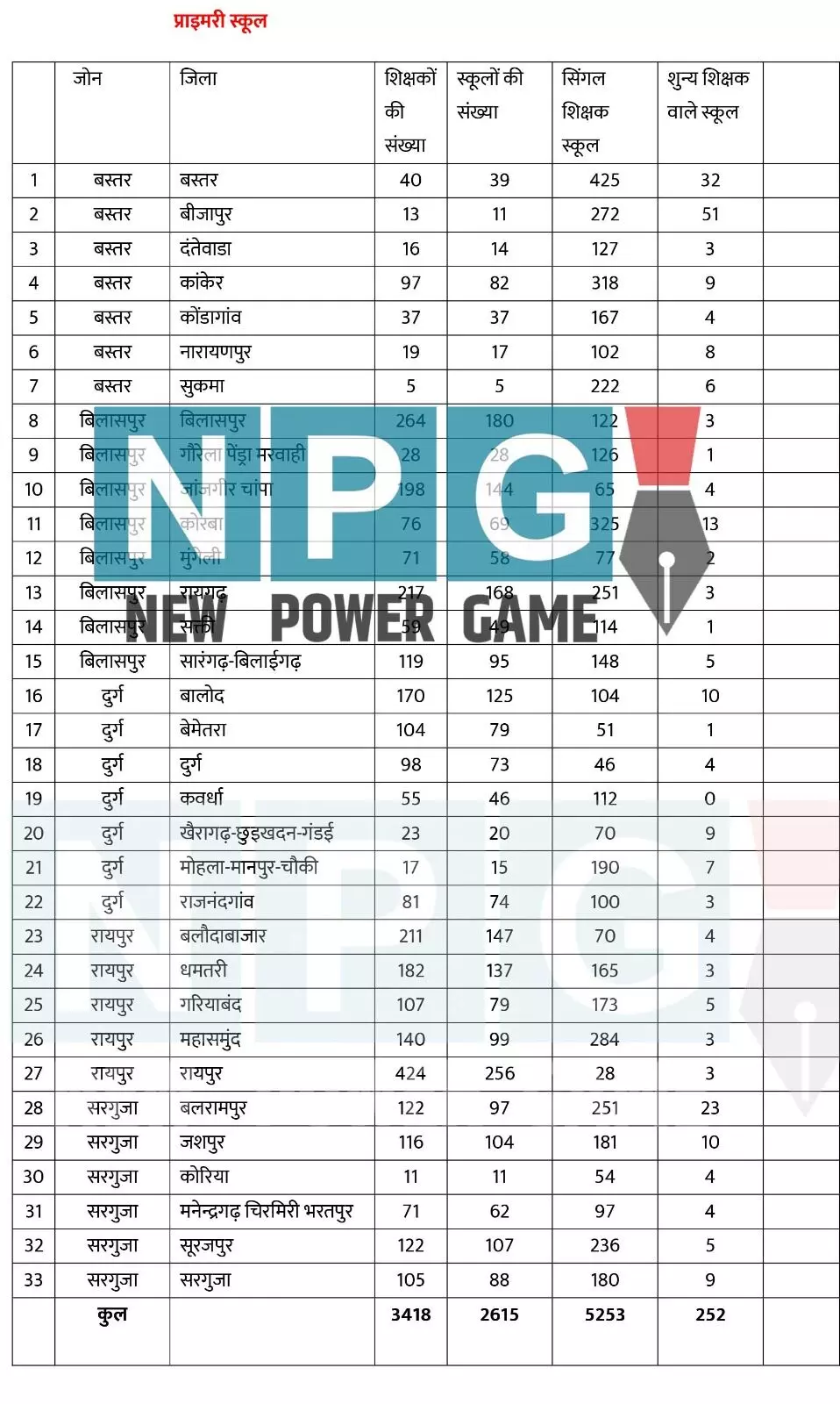 छत्तीसगढ़ के प्रायमरी स्कूलों में 3418 शिक्षक सरप्लस हैं। इनमें रायपुर सबसे उपर है। रायपुर में 424 शिक्षक अतिशेष हैं। इसी तरह बिलासपुर में 264, जांजगीर 198, रायगढ़ 217, बलौदा बाजार 211, बालोद 170, धमतरी 180 टीचर अतिशेष हैं। प्रायमरी स्कूलों में सबसे अधिक बस्तर में 425 स्कूल सिंगल टीचर के भरोसे चल रहे हैं। इसी तरह बीजापुर 272, कांकेर 318, सुकमा 222, कोरबा 325, रायगढ़ 251, मोहला-मानपुर 190, धमतरी 165, गरियाबंद 173, बलरामपुर 251, जशपुर 181, सूरजपुर 236, सरगुजा में 196 सिंगल शिक्षक वाले स्कूल हैं।