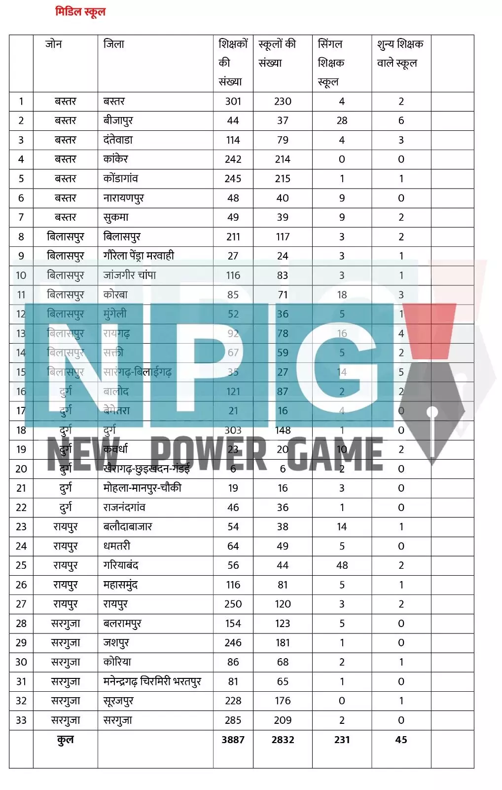 छत्तीसगढ़ के मीडिल स्कूलों में 3887 शिक्षक अतिशेष हैं। इनमें सबसे अधिक बस्तर में 301, कांकेर 242, कोंडागांव 245, बिलासपुर 211, दुर्ग 303, रायपुर 250, जशपुर 246, सरगुजा 285, सूरजपुर 228 शामिल हैं। मीडिल स्कूलों में सिंगल टीचर वाले स्कूल सबसे अधिक गरियाबंद 48, बीजापुर 28, कोरबा 18, रायगढ़ 16 और कवर्धा 10 हैं। वहीं इन जिलों में क्रमशः 2, 6, 3, 4, 2 स्कूल शिक्षक विहीन हैं।
