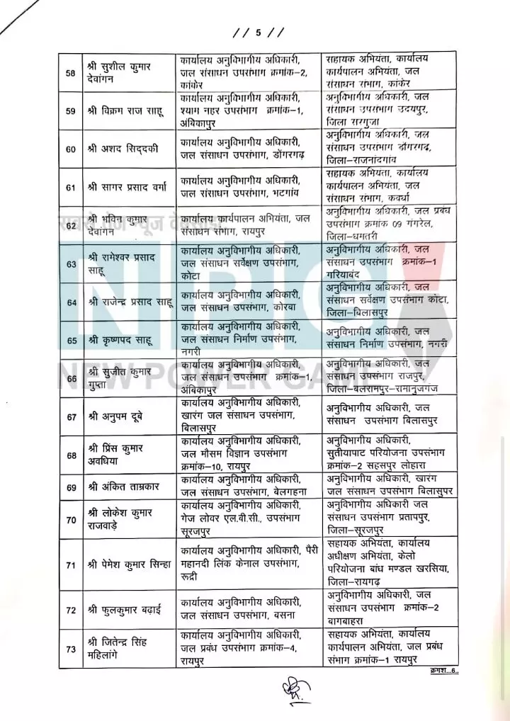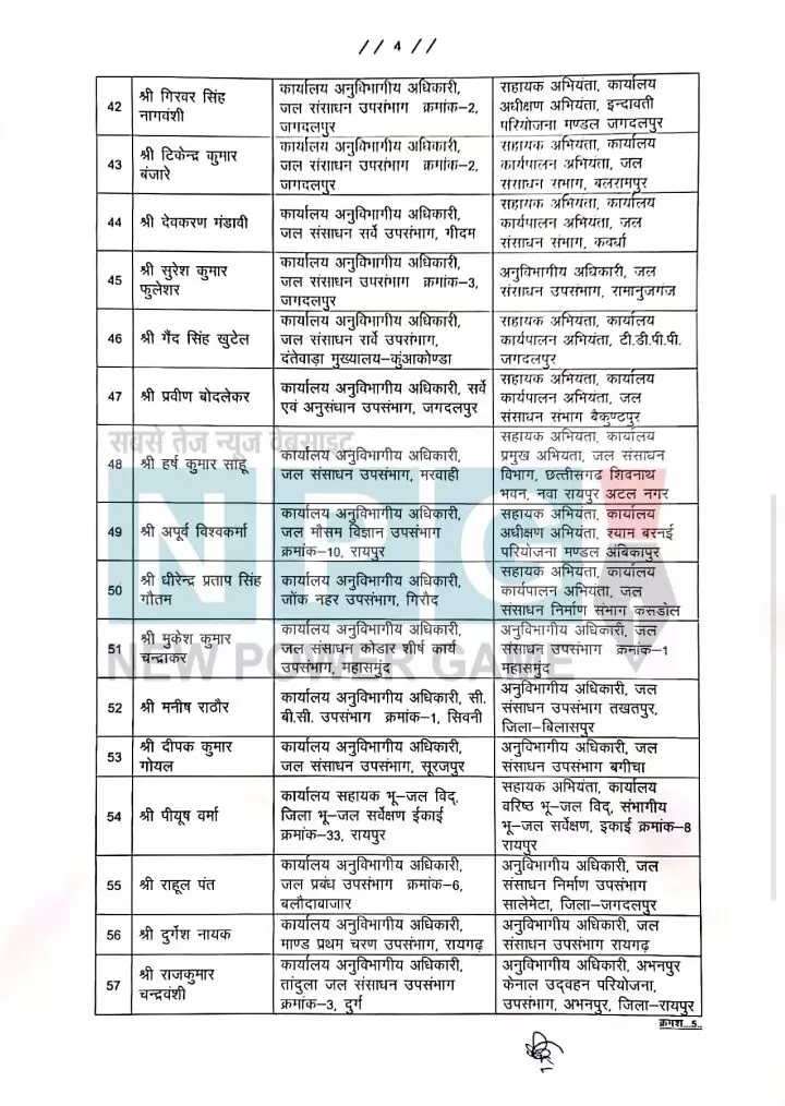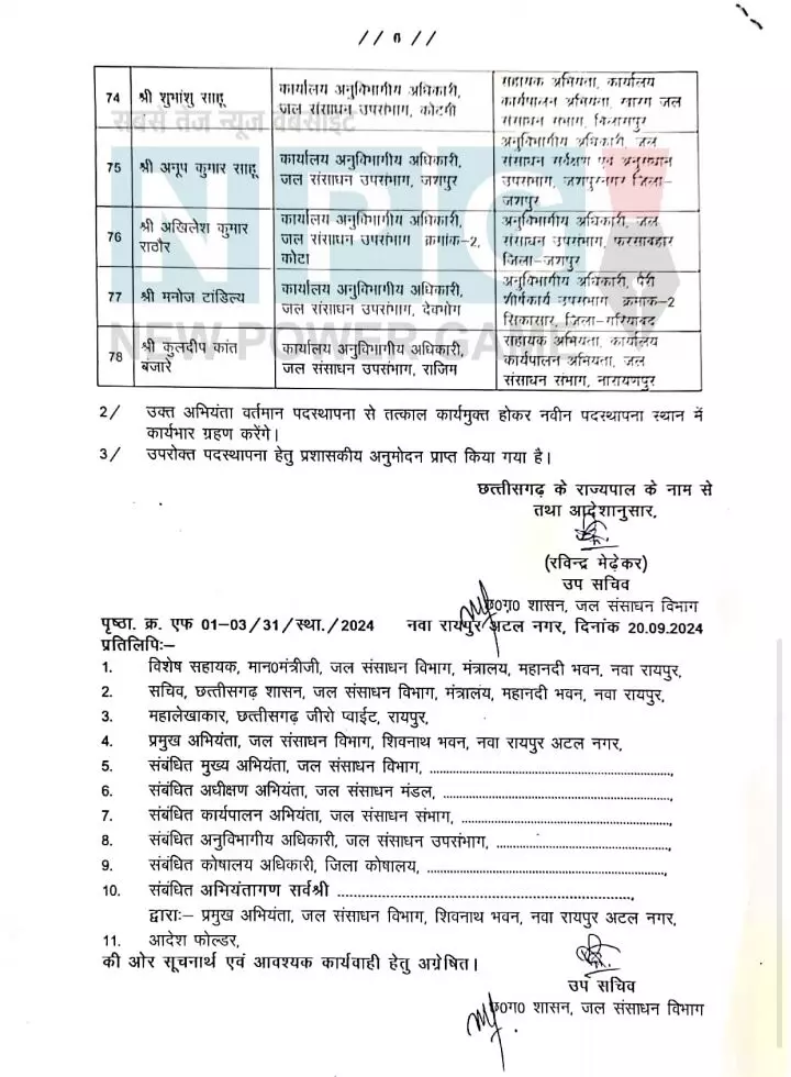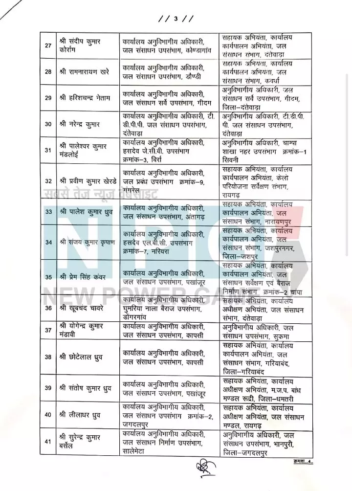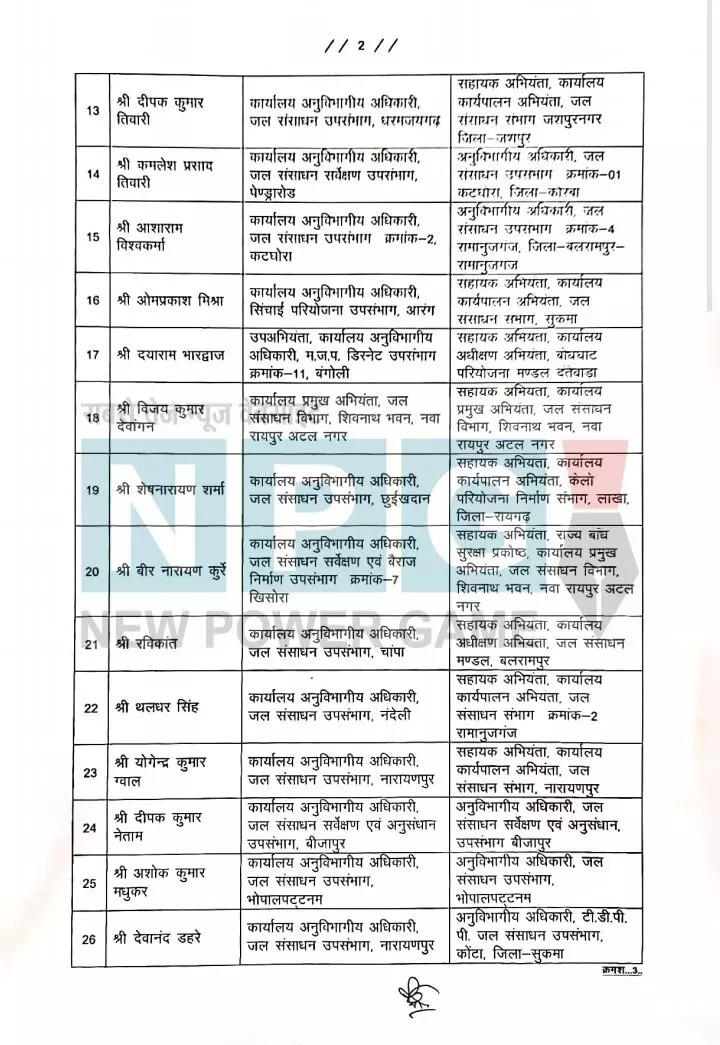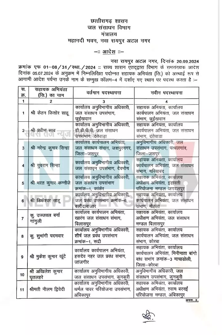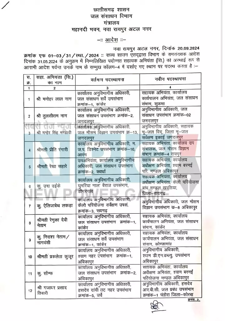 CG Transfer News 2024: रायपुर। जल संसाधन विभाग में पदोन्नति के उपरांत सहायक अभियंता बने अधिकारियों की पोस्टिंग आदेश जारी किए गए हैं। दो आदेश निकालकर कुल 89 अधिकारियों को पदस्थापना दी गई है। ट्रांसफर हुए सहायक अभियंताओं में से कई को फील्ड में पोस्टिंग दी गई है। जिनके ट्रांसफर हुए हैं उन्हें निर्देशित किया गया है कि वर्तमान पद स्थापना स्थल से तत्काल कार्य मुक्त होकर नवीन पदस्थापना स्थल में कार्यभार ग्रहण करें। देखें आदेश…