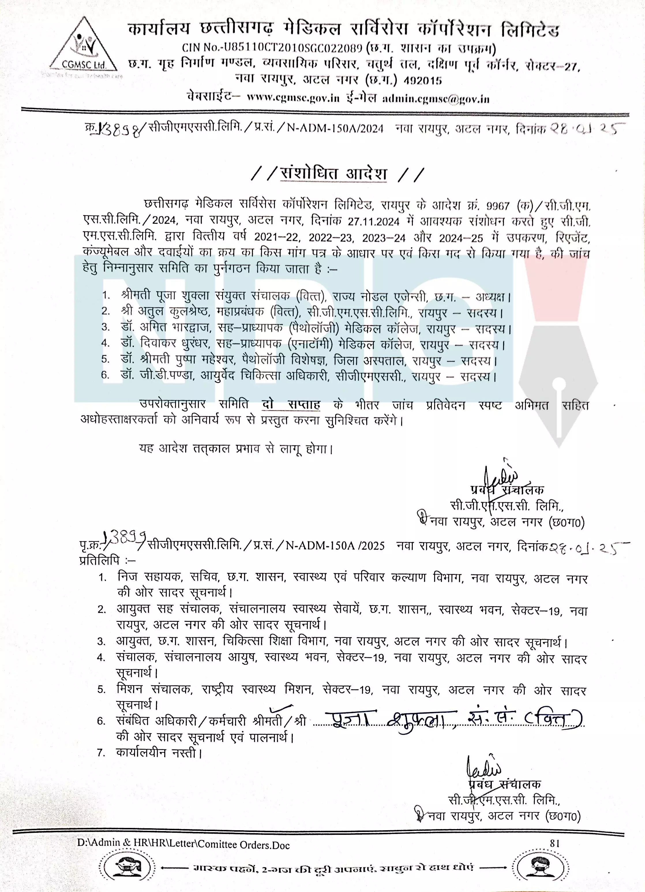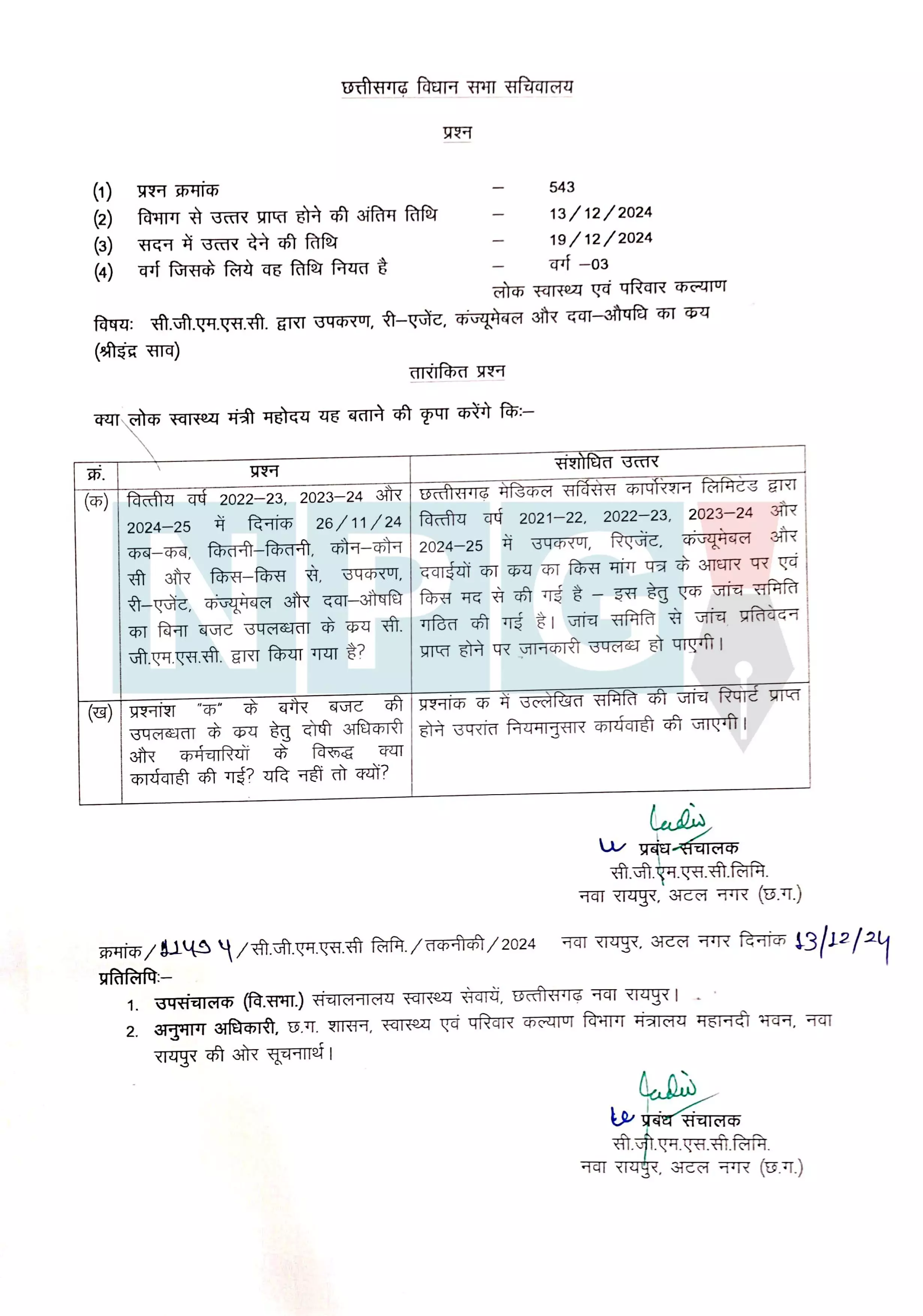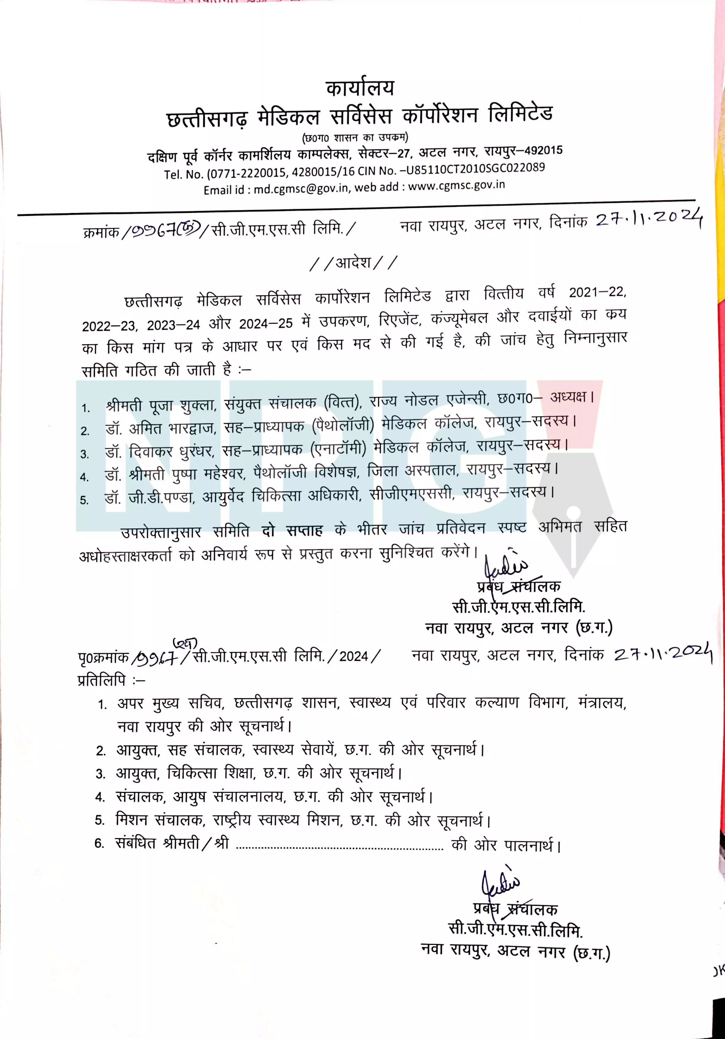 एनपीजी न्यूज के पास सीजीएमएससी का विधानसभा को दिया गया संशोधित जवाब है। एमडी के दस्तखत से भेजे आदेश में लिखा है कि जांच कमेटी का गठन किया गया है। कमेटी की रिपोर्ट मिलते ही दोषी अधिकारियों पर कार्रवाई की जाएगी। जवाब के साथ ही 27 नवंबर 2024 की डेट में गठित जांच आयोग का आदेश भी संलग्न था।
