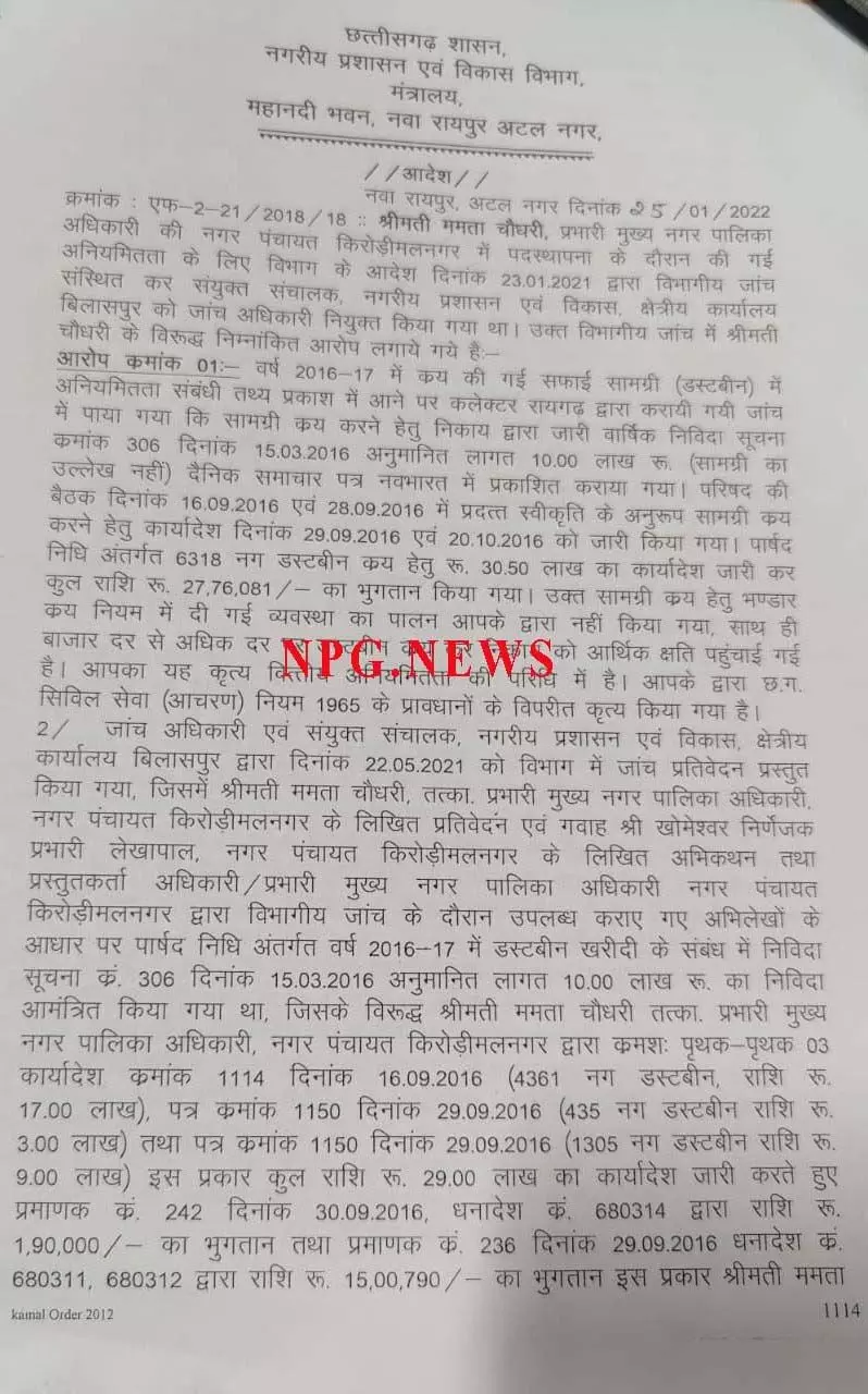 नगरीय प्रशासन विभाग के बिलासपुर संभाग के संयुक्त संचालक ने 6 मार्च 2024 को खरसिया नगर पालिका परिषद के मुख्य नगर पालिका अधिकारी को पत्र लिखकर ममता चौधरी के खिलाफ विभाग की तरफ से की गई नुशंसा के आधार पर कार्यवाही करने का निर्देश जारी किया है।