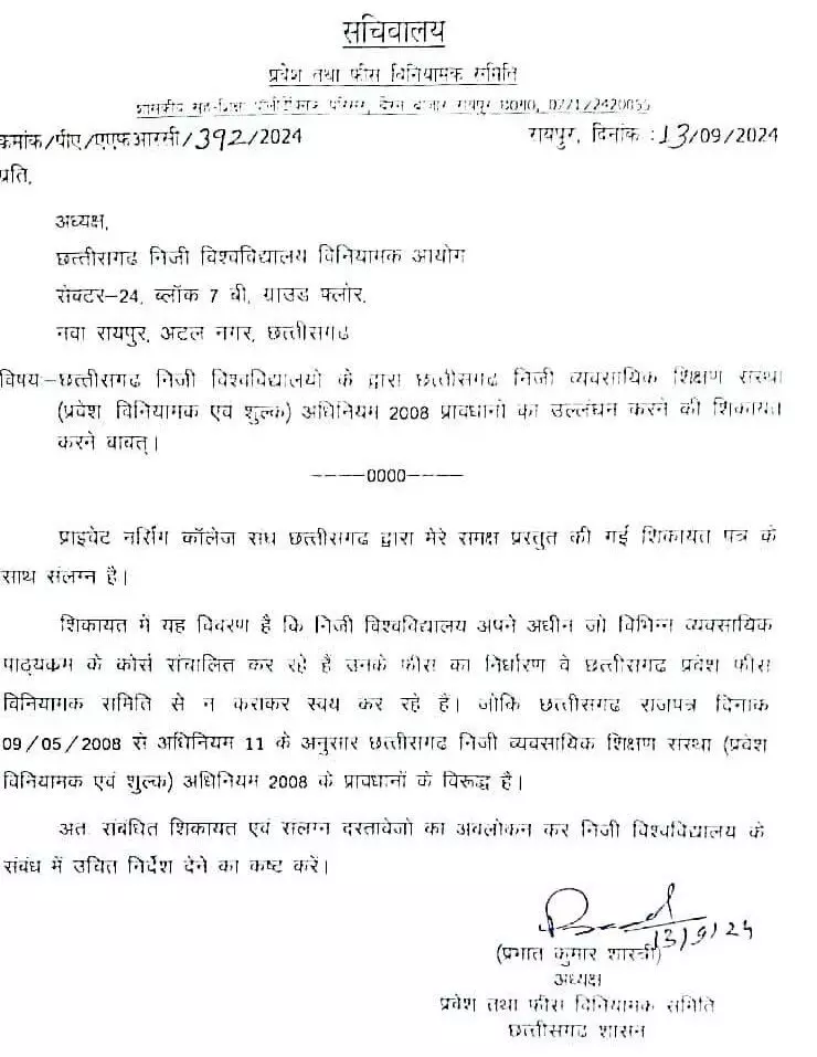 फीस विनियामक आयोग के अध्यक्ष ने पत्र में बताया है कि प्राइवेट नर्सिंग कॉलेज संघ ने लिखित शिकायत की है। इसमें संघ की तरफ से बताया गया है कि निजी विश्वविद्यालय अपने अधीन जो विभिन्न व्यवसायिक पाठ्यक्रम के कोर्स संचालित कर रहे है उनके फीस का निर्धारण वे छत्तीसगढ प्रदेश फीस विनियामक समिति से न कराकर स्वय कर रहे है। जोकि छत्तीसगढ़ राजपत्र 09/05/2008 से अधिनियम 11 के अनुसार छत्तीसगढ निजी व्यवसायिक शिक्षण सरथा (प्रवेश विनियामक एवं शुल्क) अधिनियम 2008 के प्रावधानों के विरूद्ध है। आयोग ने निजी विश्वविद्यालयों को निर्देश जारी करने के लिए कहा है।