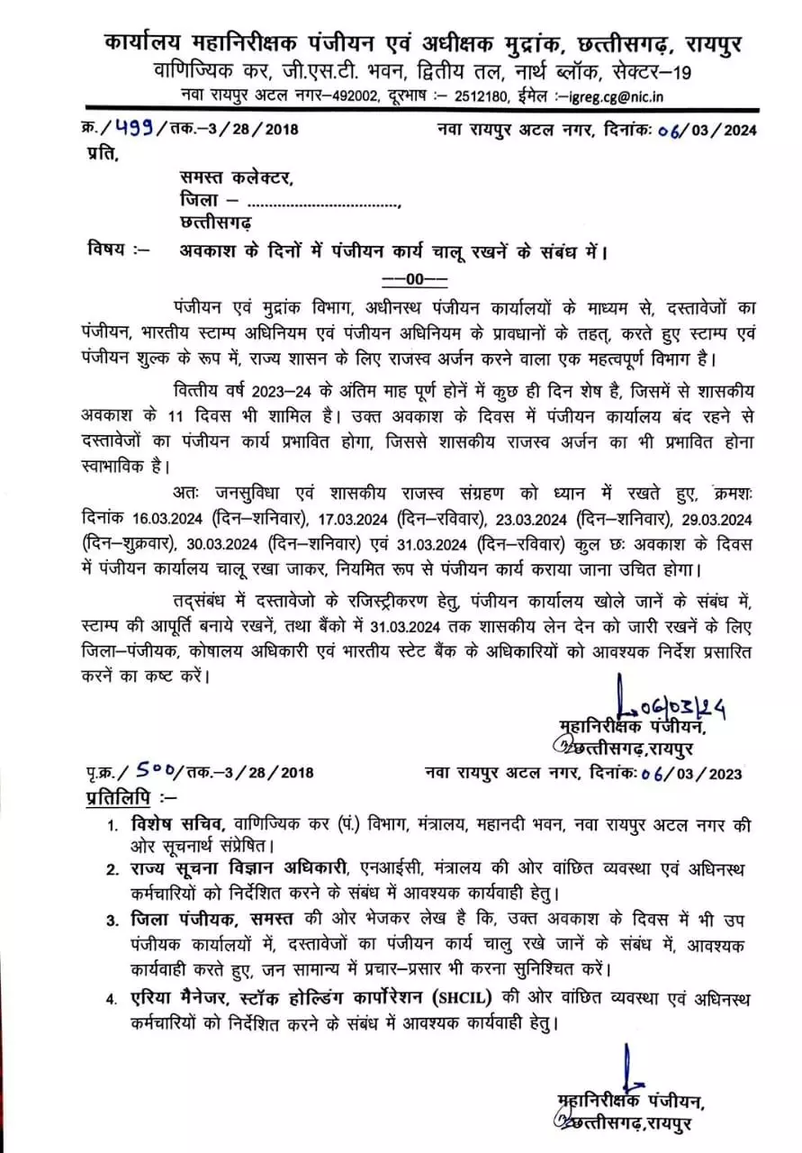 16 मार्च शनिवार, 17 मार्च रविवार, 23 मार्च शनिवार, 29 मार्च शुक्रवार, 30 मार्च शनिवार एवं 31 मार्च रविवार कुल 6 अवकाश के दिवसों में पंजीयन कार्यालय चालू रखा जाएगा।
