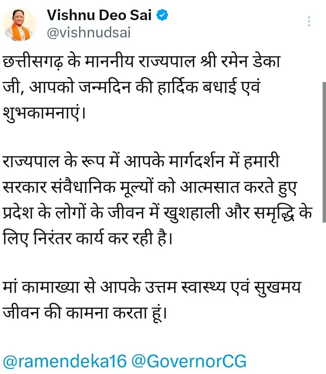 मुख्यमंत्री साय ने राज्यपाल को जन्मदिवस की शुभकामनाएं देते हुए कहा कि “राज्यपाल के रूप में आपके मार्गदर्शन से हम संवैधानिक मूल्यों को आत्मसात करते हुए प्रदेश के लोगों के जीवन में खुशहाली और समृद्धि के लिए निरंतर कार्य कर रही है” साथ ही मुख्यमंत्री ने मां कामाख्या से राज्यपाल के उत्तम स्वास्थ्य एवं सुखमय जीवन की कामना भी की। नीचे पढ़ें एक्स पोस्ट…