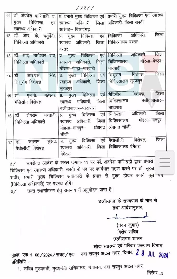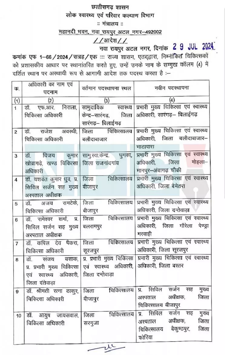 CMO, सिविल सर्जन ट्रांसफर: छत्तीसगढ़ के स्वास्थ्य विभाग में वाड़े तबादले, 11 जिलों के CMO, सिविल सर्जन समेत 17 बदले गए…