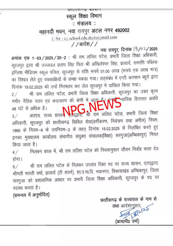 दरअसल, राम ललित पटेल, प्रभारी जिला शिक्षा अधिकारी, सूरजपुर द्वारा उज्जवल प्रताप सिंह पिता अखिलेश्वर सिंह प्राचार्य रामरति पब्लिक इंग्लिश मीडियम स्कूल पचिरा सूरजपुर से 1 लाख (रुपये एक लाख मात्र) की रिश्वत लेते हुए एसीबी ने पकड़ा था। एन्टी करप्शन ब्यूरो द्वारा 15 फरवरी को उन्हें गिरफ्तार कर जेल सूरजपुर में दाखिल किया गया।