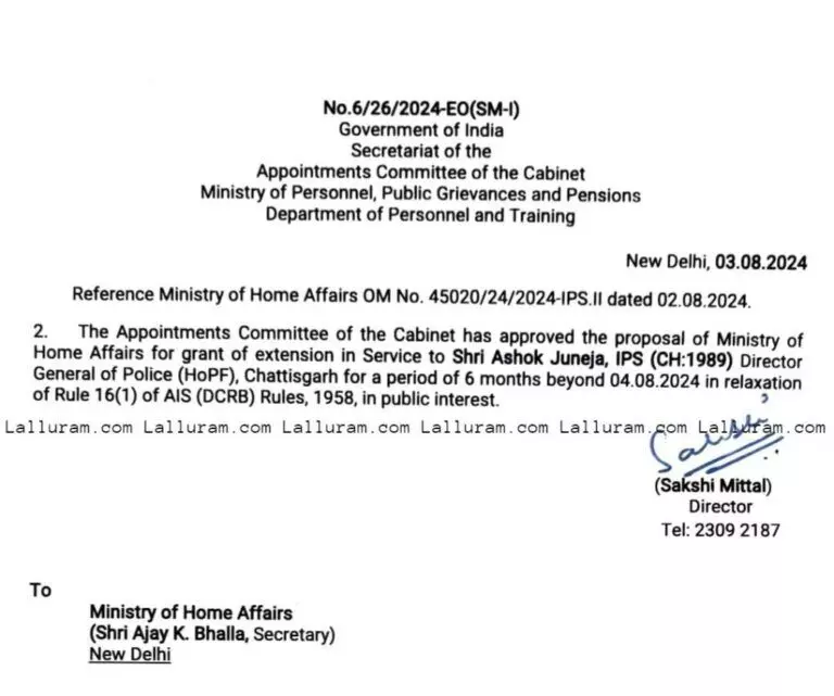 DGP Ashok Juneja रायपुर। डीजीपी अशोक जुनेजा को एक्सटेंशन देने के मिनिस्ट्री ऑफ़ होम अफेयर्स के प्रपोजल को केंद्रीय कार्मिक प्रशिक्षण मंत्रालय ने किया स्वीकार