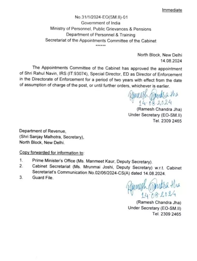संजय मिश्रा का 15 सितंबर 2023 को कार्यकाल खत्म होने के बाद कार्यवाहक निदेशक के तौर पर राहुल नवीन कार्यभार संभाल रहे थे। अब उन्हें प्रधानमंत्री नरेंद्र मोदी की अध्यक्षता वाली कमेटी ने पूर्णकालिक निदेशक नियुक्त किया है। बता दे कि राहुल नवीन को प्रवर्तन निदेशालय में डाटा एनालिसिस्ट और मनी लांड्रिंग के विशेषज्ञ के तौर पर जाना जाता है।