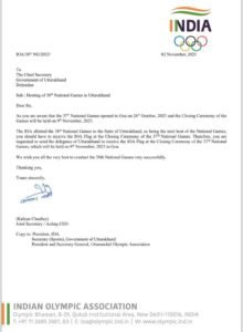 उत्तराखंड अगले साल 2024 में 38वें राष्ट्रीय खेलों की मेजबानी करेगा। इसके लिए भारतीय ओलंपिक संघ का ध्वज उत्तराखंड को नौ नवंबर को दिया जाएगा।