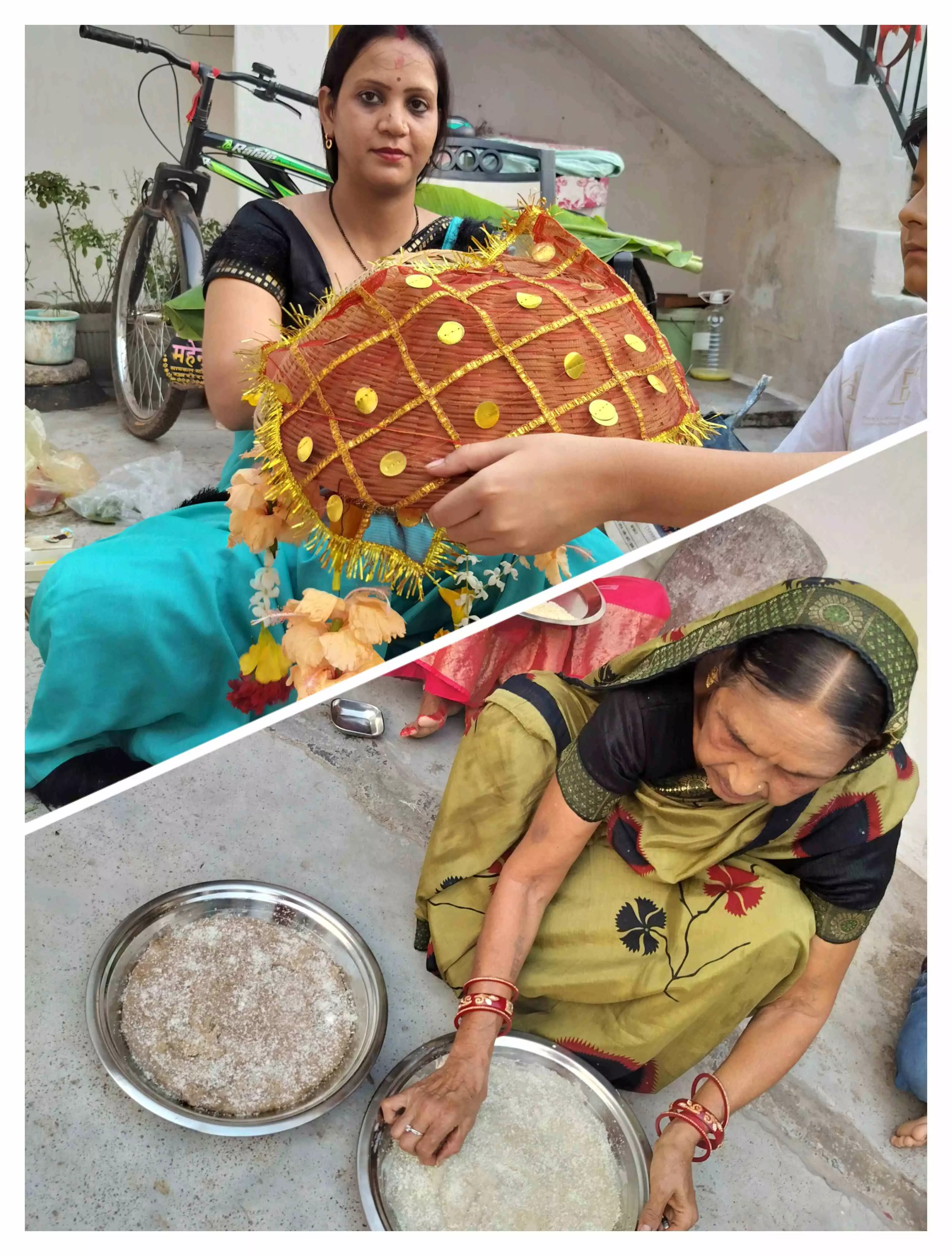 पूजा के लिए फुलेरा और प्रसाद की तैय्यारी करती हुई महिलाएं।