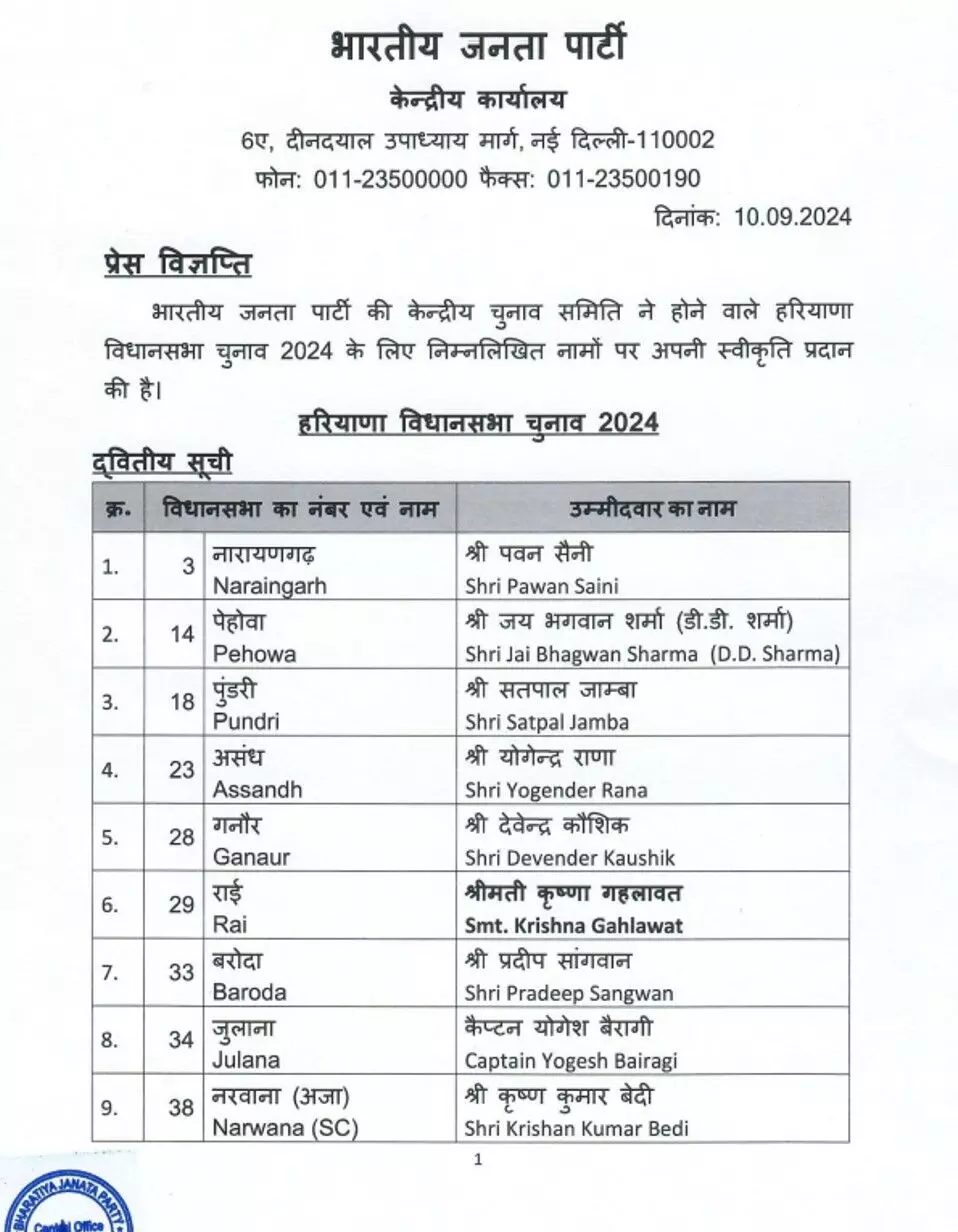 Haryana BJP 2nd Candidates Update: हरियाणा बीजेपी ने जारी की उम्मीदवारों की दूसरी लिस्ट, जानिए किसे कहाँ से मैदान में उतारा?