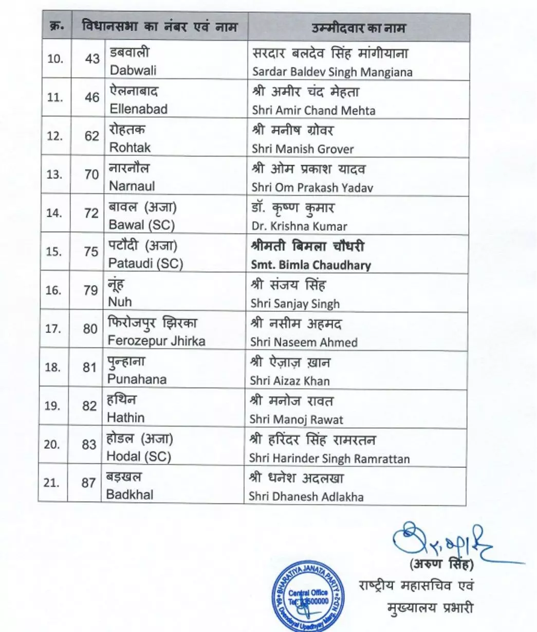 इसके अलावा BJP ने राय से कृष्णा गहलावत और पटौदी से बिमला चौधरी को मैदान में उतारा है। BJP के राष्ट्रीय महासचिव अरुण सिंह की ओर से जारी लिस्ट में राज्य की 21 विधानसभा सीटों के लिए उम्मीदवारों के नाम हैं, जहां चुनाव होने हैं। लिस्ट के मुताबिक, मनीष ग्रोवर रोहतक से, संजय सिंह नूंह से और ऐजाज खान पुनहाना से चुनाव लड़ेंगे। पवन सैनी नारायणगढ़ से, सतपाल जाम्बा पूंडरी से और देवेन्द्र कौशिक गन्नौर से चुनाव लड़ेंगे।