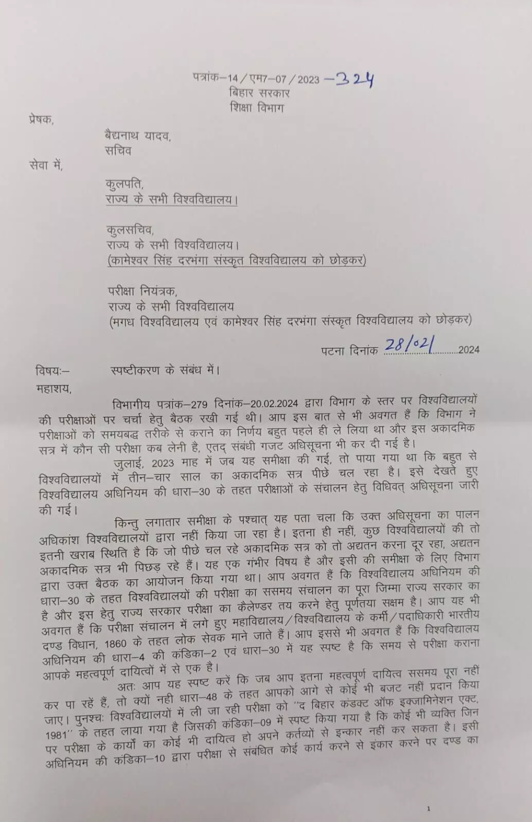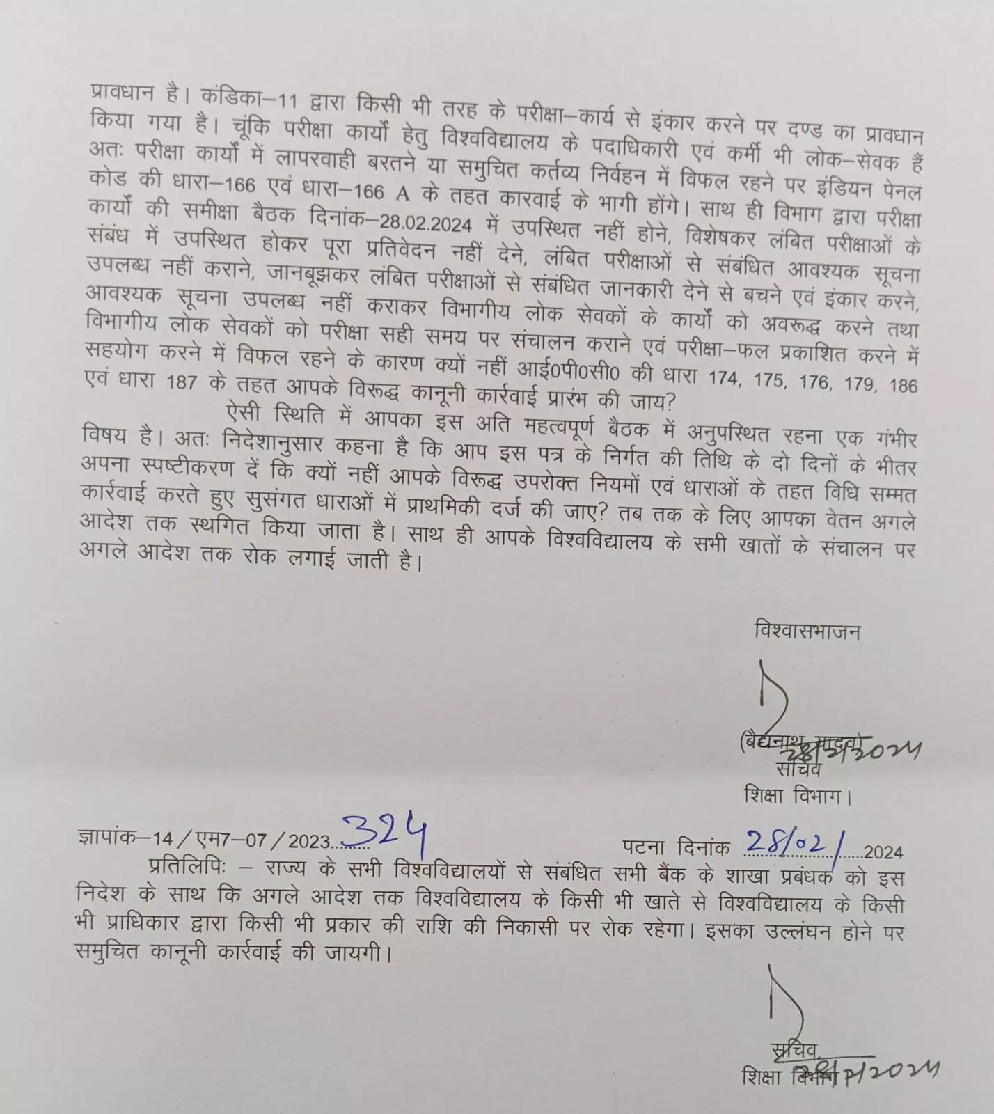जानकारी के मुताबिक, मंगलवार को शिक्षा विभाग की ओर से बैठक बुलाई गयी थी. बुधवार, 28 फरवरी को विश्वविद्यालय के कुलपति, कुलसचिव् और परीक्षा निरीक्षक समेत सभी अधिकारियों को अनिवार्य रूप से शामिल होने को कहा गया था. इसके बावजूद कोई भी अधिकारी मौके पर नहीं पहुंचे. जिसके बाद केके पाठक ने सभी विश्वविद्यालयों के कुलपति समेत सभी अधिकारियों के वेतन पर रोक लगा दी. इतना ही नहीं विश्वविद्यालय के बैंक खाते को भी फ्रीज कर दिया गया है. साथ ही बैठक में उपस्थित नहीं को लेकर केके पाठ ने शो कॉज नोटिस जारी किया है. उन्होंने बैठक में शामिल नहीं होने पर वीसी और रजिस्ट्रार से स्पष्टीकरण मांगा है कि 28 फरवरी की अहम बैठक में आप लोग मौजूद नहीं थे. लिहाजा क्यों नहीं आप लोगों पर प्राथमिकी दर्ज की जाए?