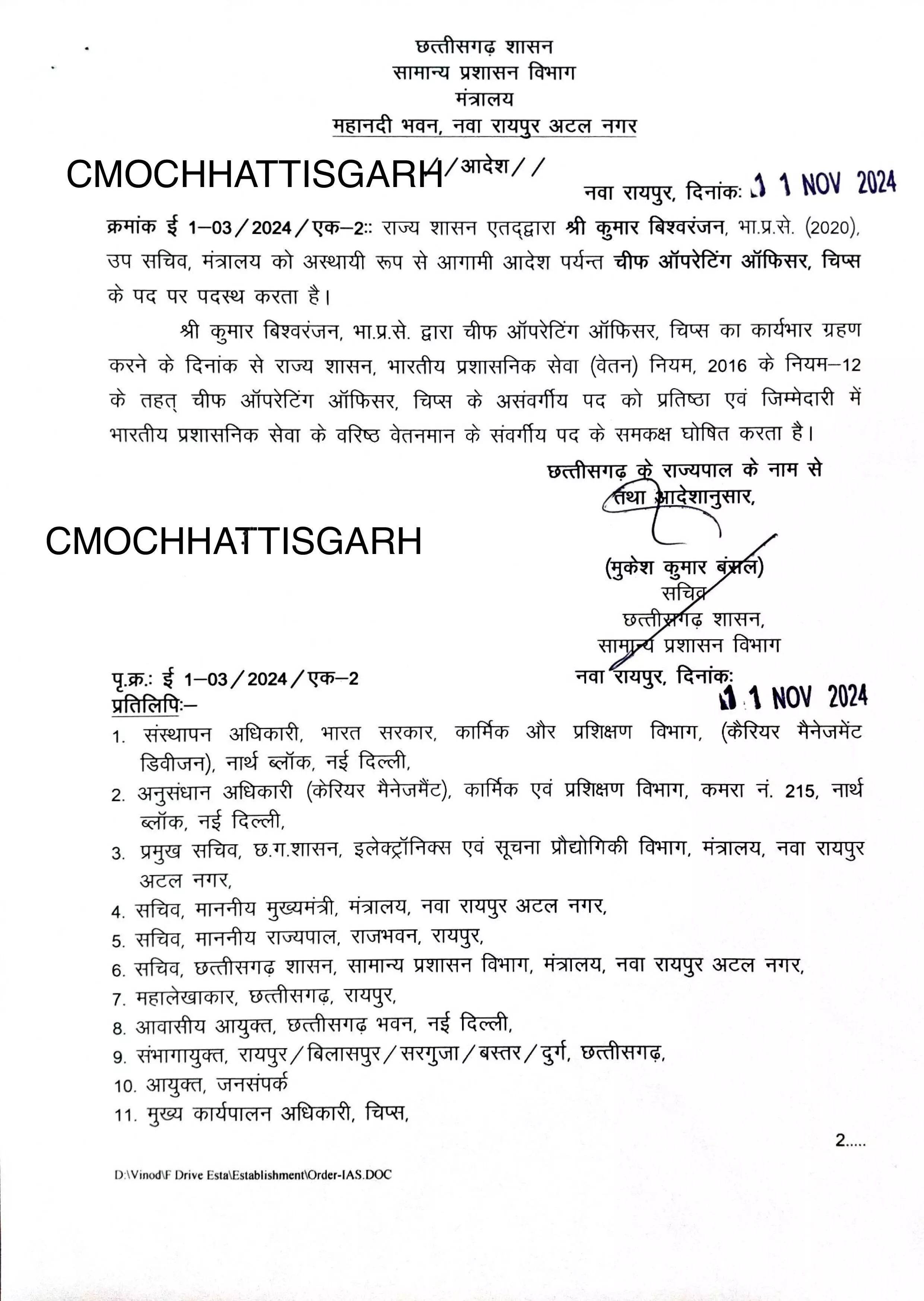 इस संबंध में सामान्य प्रशासन विभाग की तरफ से आदेश जारी किया गया है. जारी आदेश के अनुसार, राज्य शासन एतद्वारा कुमार बिश्वरंजन, भा.प्र.से. (2020), उप सचिव, मंत्रालय को अस्थायी रूप से आगामी आदेश पर्यन्त चीफ ऑपरेटिंग ऑफिसर, चिप्स के पद पर पदस्थ किया गया है. भारतीय प्रशासनिक सेवा (वेतन) नियम, 2016 के नियम-12 के तहत् चीफ ऑपरेटिंग ऑफिसर, चिप्स के असंवर्गीय पद को प्रतिष्ठा एवं जिम्मेदारी में भारतीय प्रशासनिक सेवा के वरिष्ठ वेतनमान के संवर्गीय पद के समकक्ष घोषित किया गया है.