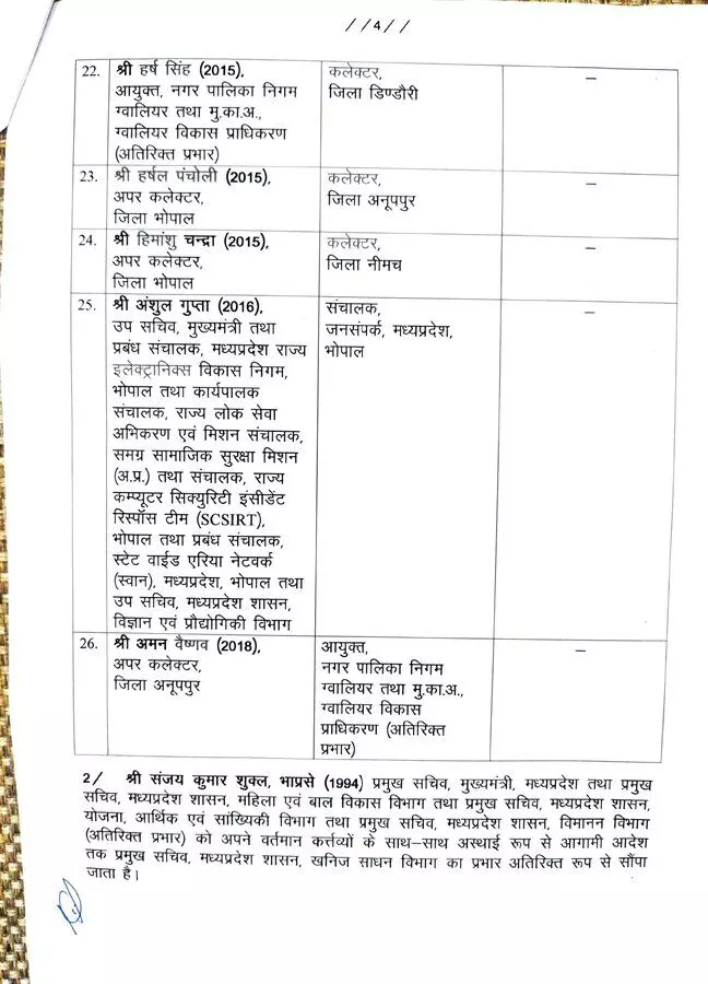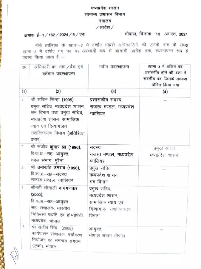 IAS Transfer 2024: मध्य प्रदेश में बड़ा प्रशासनिक फेरबदल हुआ है. शनिवार देर रात बड़ी संख्या में आईएएस अधिकारी इधर से उधर किए गए हैं. मोहन सरकार ने एक साथ 26 अफसरों का ट्रांसफर कर दिया है. जिसमें 7 जिलों के कलेक्टर भी शामिल है. बीजा मंडल मंदिर-मस्जिद विवाद के बाद विदिशा कलेक्टर को भी हटा दिया गया है. सामान्य प्रशासन विभाग ने तबादले का आदेश जारी किया है.