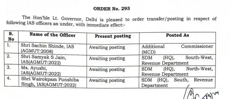 IAS Transfer News: दिल्ली सरकार ने कुछ दिनों पहले आईएएस अफसरों के ट्रांसफर किये थे. जिनमें चार आईएएस अधिकारियों को वोटिंग में रखा गया था. आईएएस अधिकारी सचिन शिंदे, आईएएस सचिन शिंदे, श्यामक एस जैन, आयुषी और वैरोकपम पुनशीबा प्रतीक्षारत थे जिन्हे नई जिम्मेदारी सौपी गयी है. इस सम्बन्ध में आदेश जारी किया है.