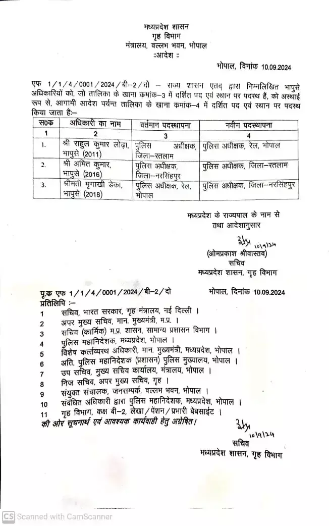 IPS Transfer News: भोपाल: मध्य प्रदेश में देर रात पुलिस विभाग में बड़ा फेरबदल किया गया है. मंगलवार को 3 आईपीएस अधिकारियों का तबादला किया गया है. सरकार ने देर रात  आईपीएस अफसरों की ट्रांसफर लिस्ट जारी की है. रतलाम एसपी आईपीएस राहुल कुमार लोढ़ा को रतलाम में भगवान गणेश की स्थापना जुलूस पर पथराव के बाद हुए बवाल के बाद हटाया गया है. आईपीएस राहुल कुमार लोढ़ा को भोपाल रेल एसपी बनाया गया है. देखें लिस्ट