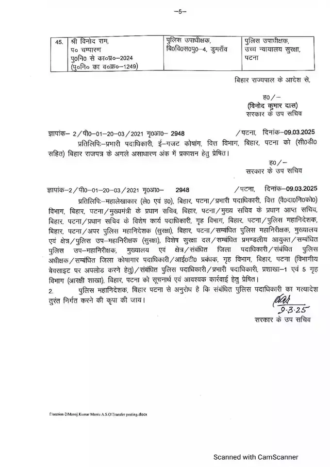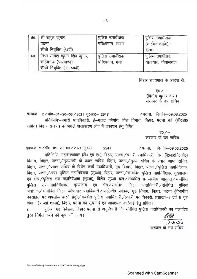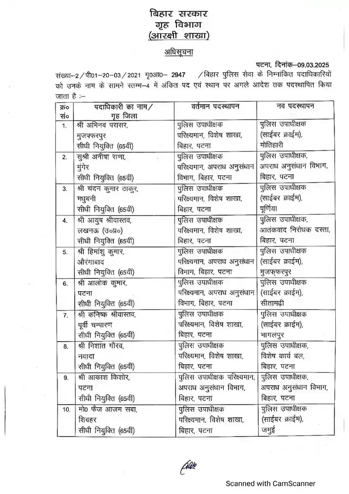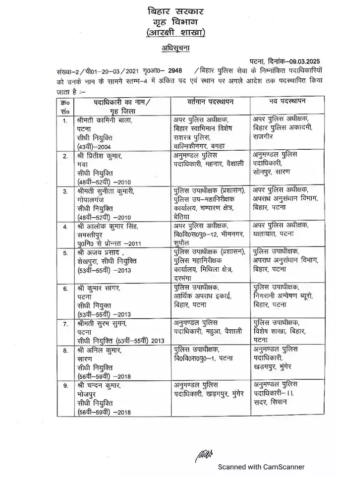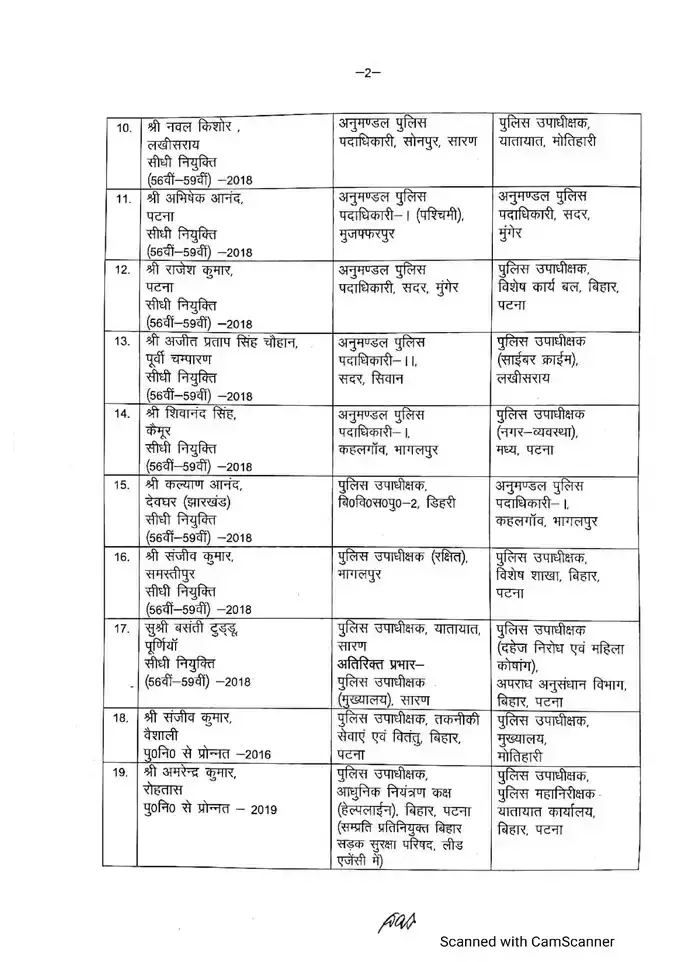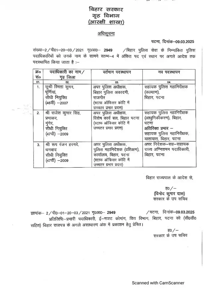 अजय प्रसाद का ट्रांसफर पुलिस अधीक्षक अपराध अनुसंधान विभाग बिहार पटना में किया गया है. कुमार सागर का ट्रांसफर पुलिस अधीक्षक निगरानी अन्वेषण ब्यूरो बिहार पटना में किया गया है. अनिल कुमार को अनुमंडल पुलिस पदाधिकारी खड़कपुर मुंगेर बनाया गया है. नवल किशोर को पुलिस अधीक्षक यातायात मोतिहारी का बनाया गया है. राजेश कुमार को पुलिस उपाधीक्षक विशेष कार्य बल बिहार पटना भेजा गया है .
