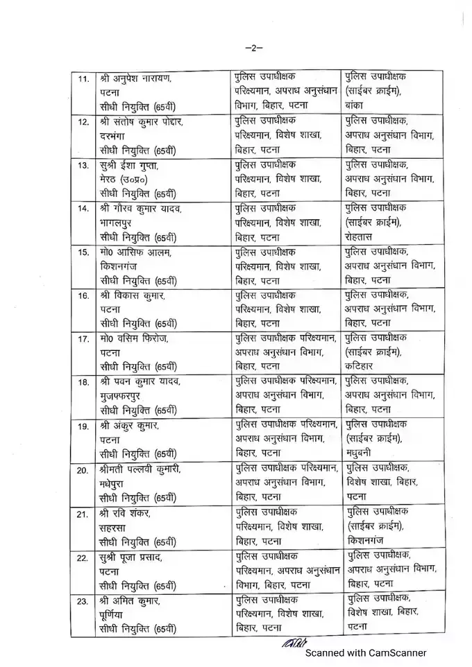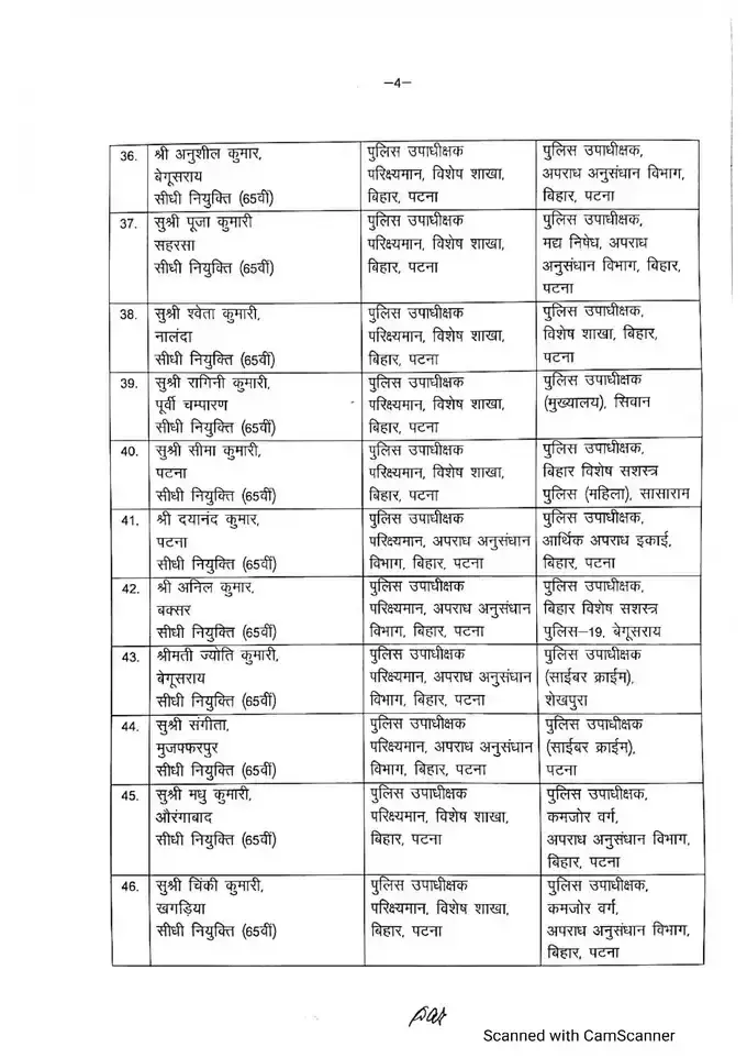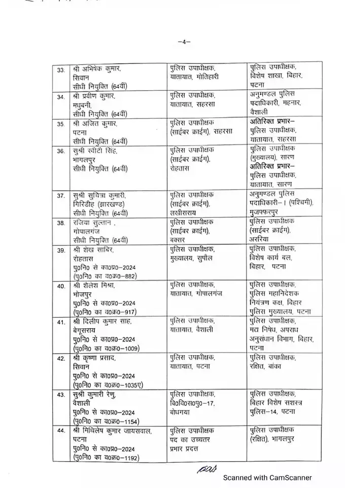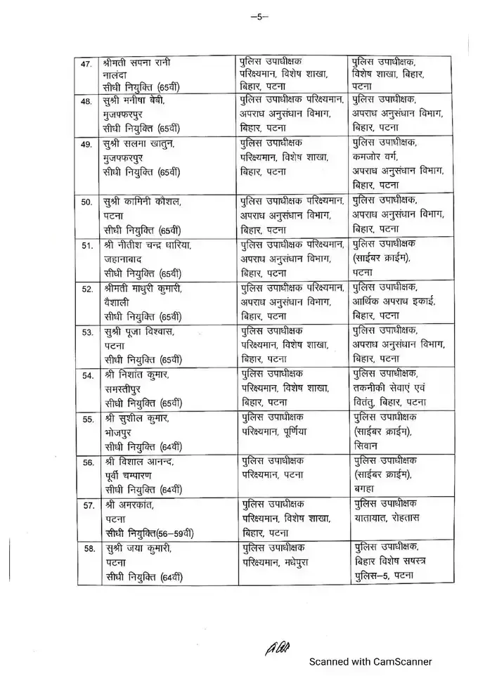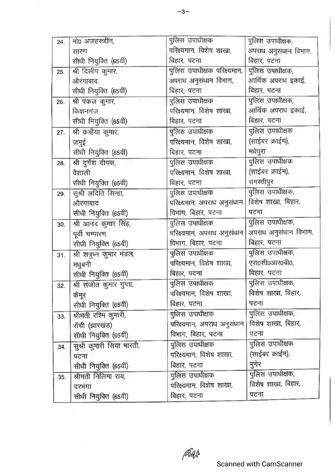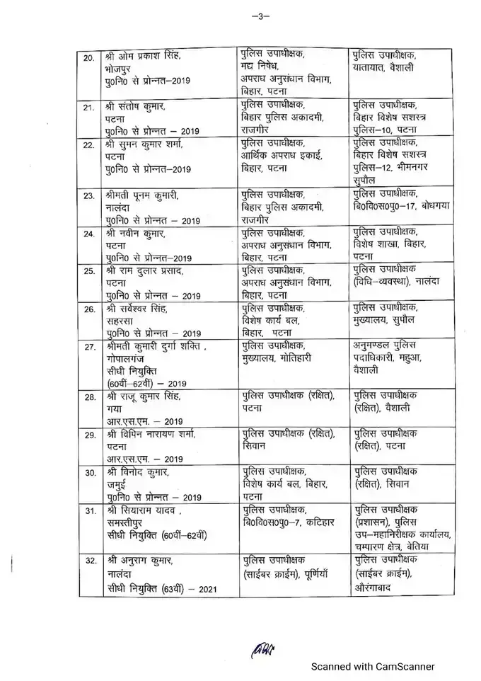 अजीत प्रताप सिंह चौहान को पुलिस अधिक उपाधीक्षक साइबर क्राइम लखीसराय की जिम्मेदारी मिली है. शिवानंद सिंह को पुलिस उपाधीक्षक नगर व्यवस्था मध्य पटना में भेजा गया है. कल्याण आनंद को अनुमंडल पुलिस पदाधिकारी कहलगांव भागलपुर का बनाया गया है. बसंती टुडू को पुलिस उपाधीक्षक दहेज निरोध एवं महिला कोषांग अपराध अनुसंधान विभाग बिहार पटना में भेजा गया है.